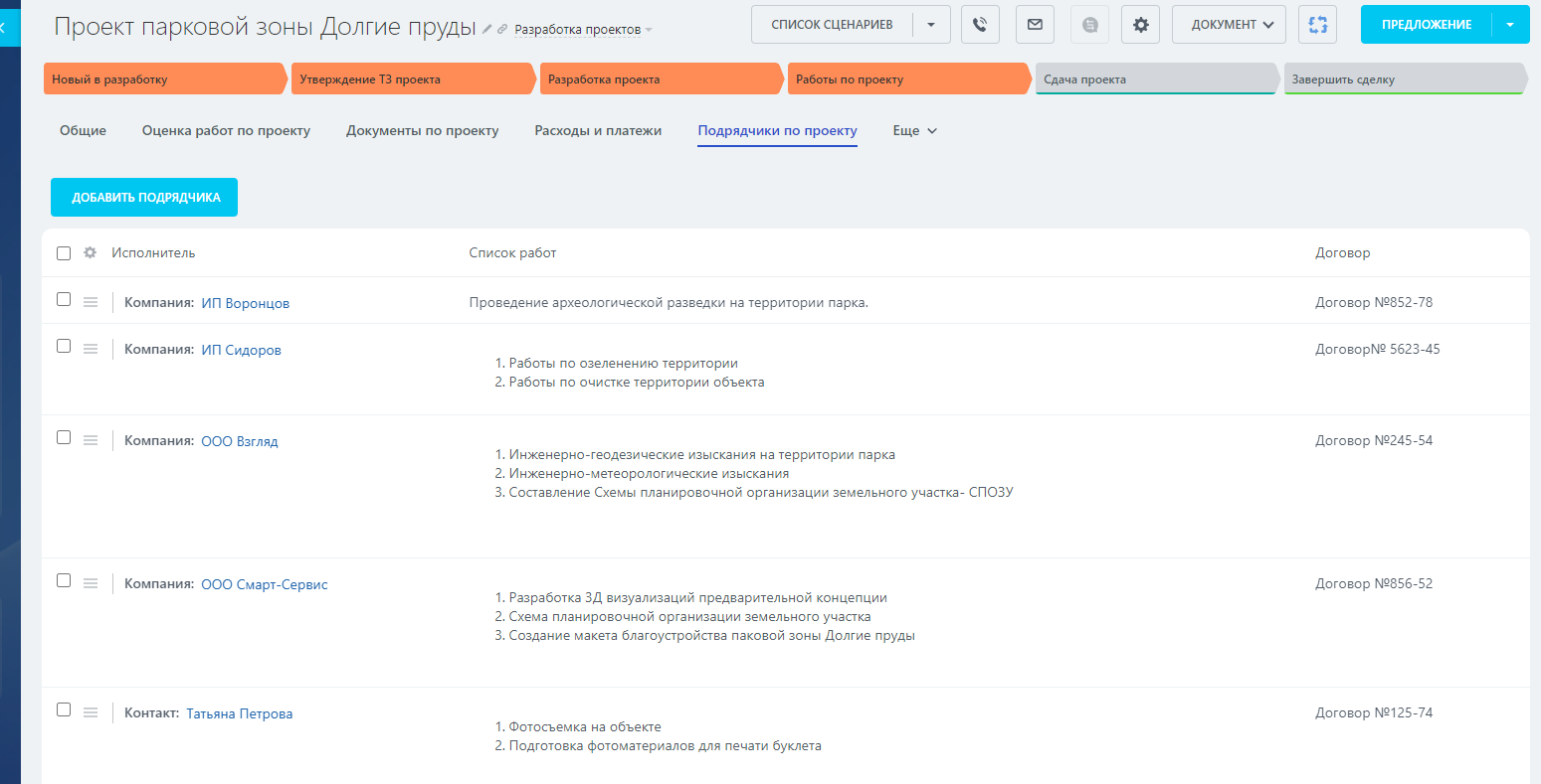 - Подрядчики по проекту – Список подрядных организаций и внешних исполнителей работ по проекту.