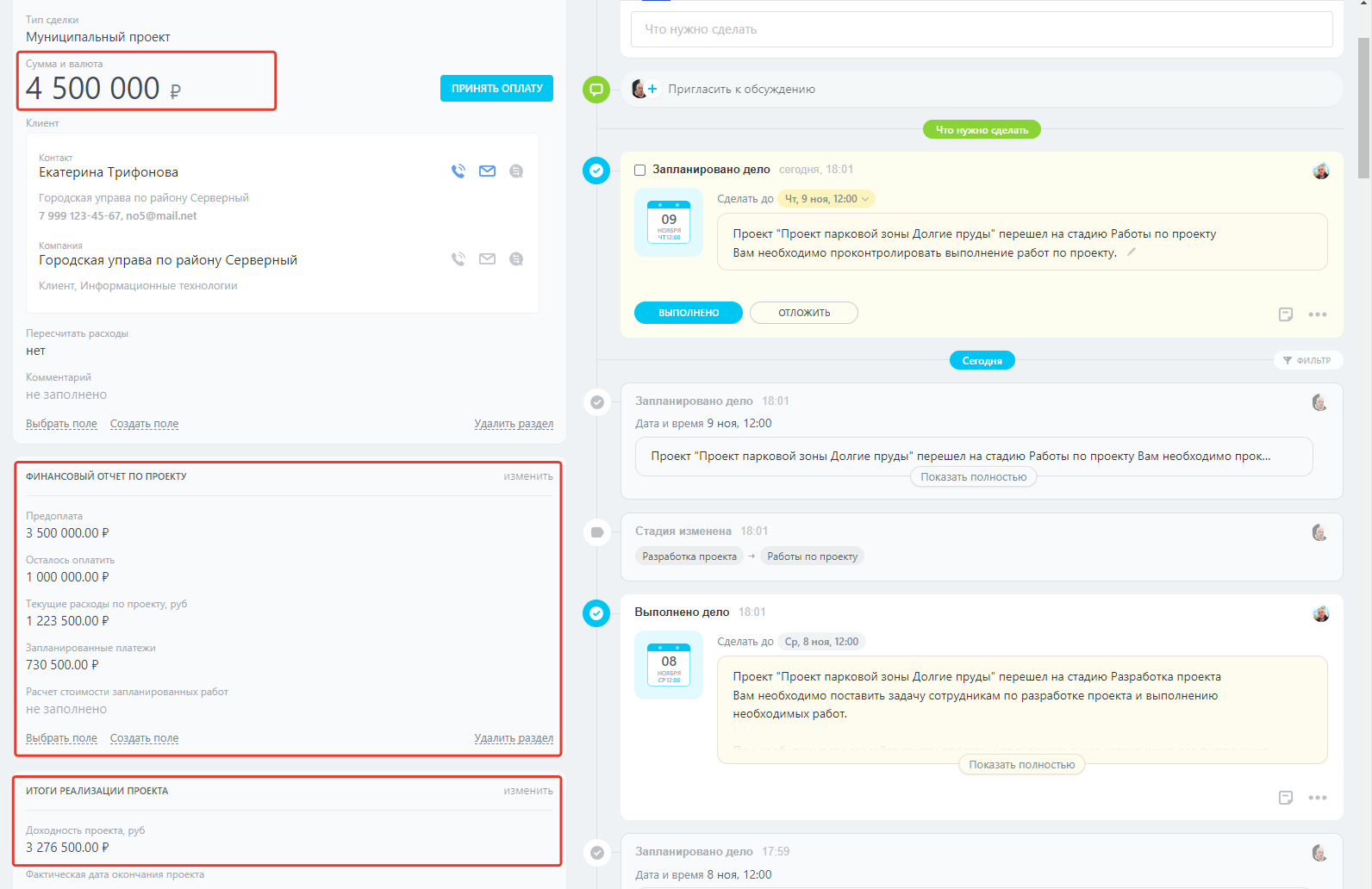 - Руководители компании могут видеть финансовую эффективность работы по проекту: доходность проекта, расходы по проекту, запланированные платежи по проекту