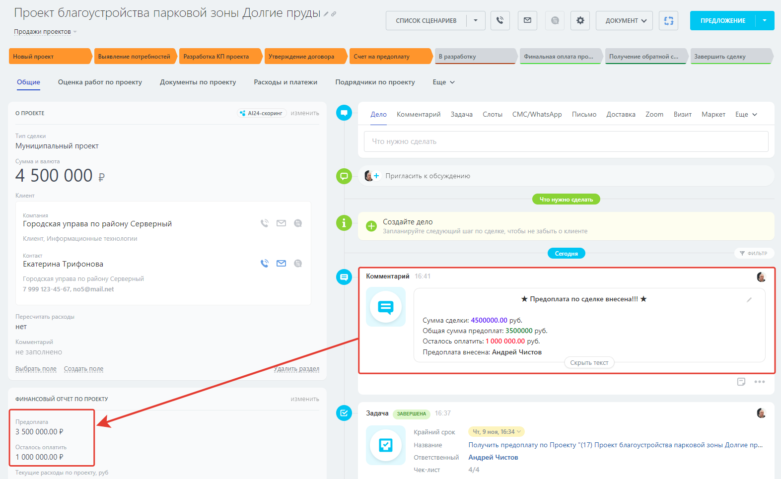 - Предоплата – Внесенные предоплаты по проекту