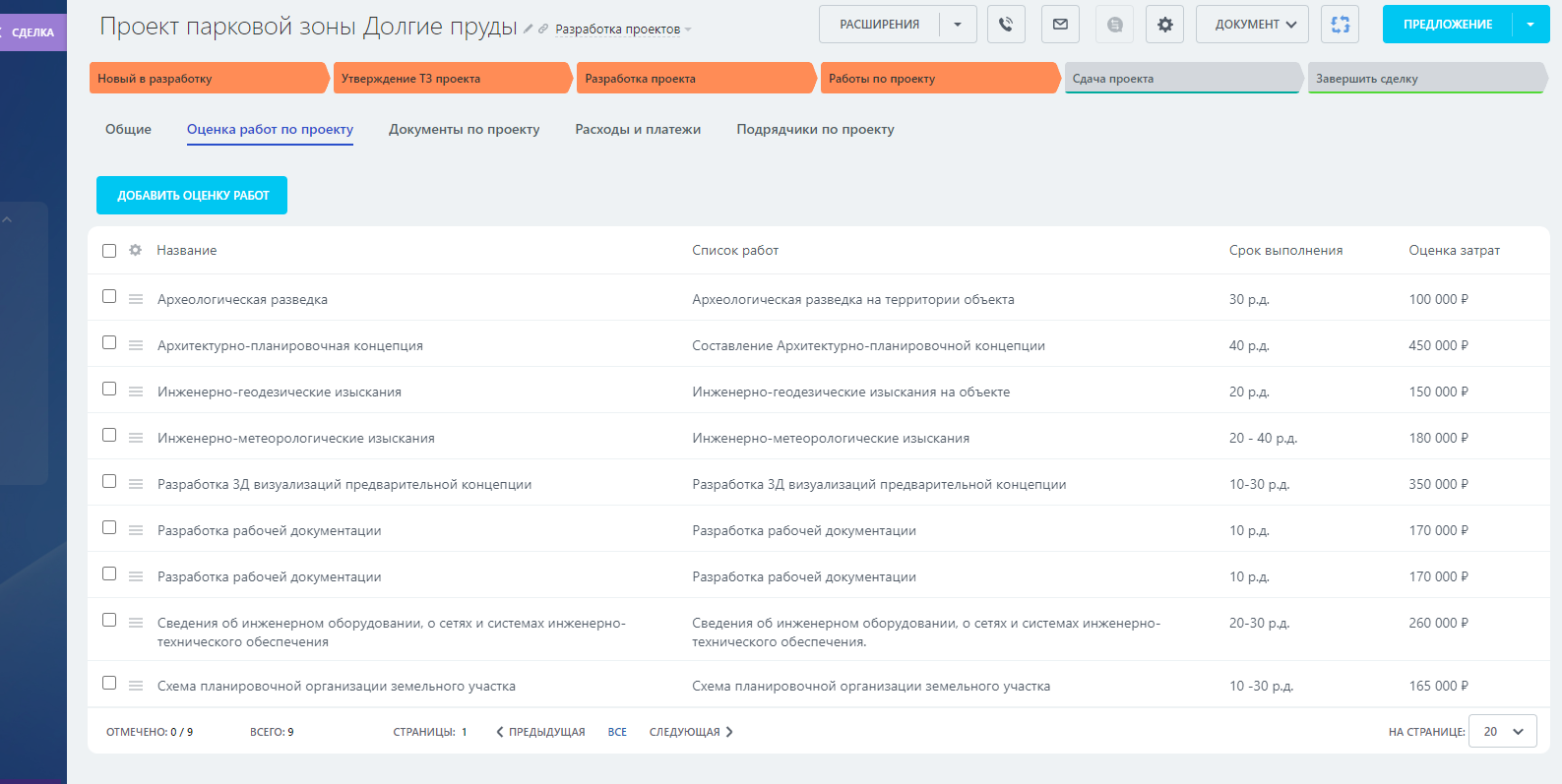 - Оценка работ по проекту – Список оценочных работ по проекту для выставления коммерческого предложения по проекту.