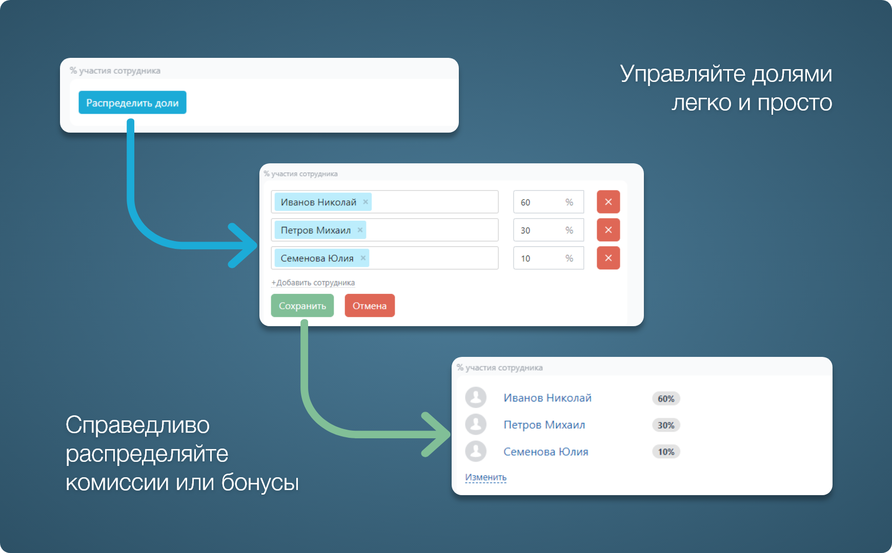 Простое управление долями сотрудников в сделке для точного распределения вознаграждений