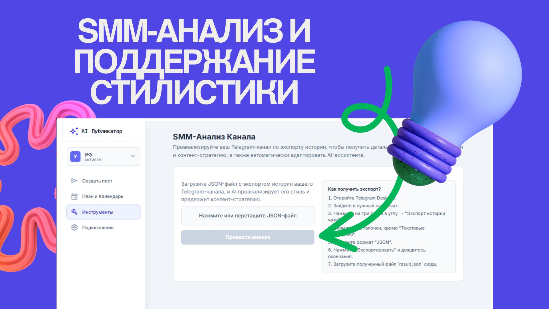 - SMM-анализ конкурентов: Загрузите файл с историей сообщений любого канала (экспорт из Telegram), и нейросеть проведет глубокий аудит: выявит ключевые темы, проанализирует вовлеченность и предложит стратегию по улучшению вашего контента.