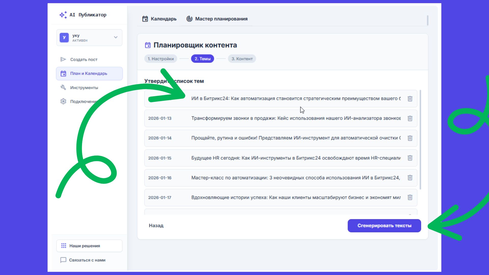 - Мастер планирования (Content Wizard): Инструмент для тех, кто ценит системный подход. Вы задаете период (например, следующая неделя) и тематику, а AI сам предлагает список тем, пишет тексты для каждого дня и распределяет их по календарной сетке.