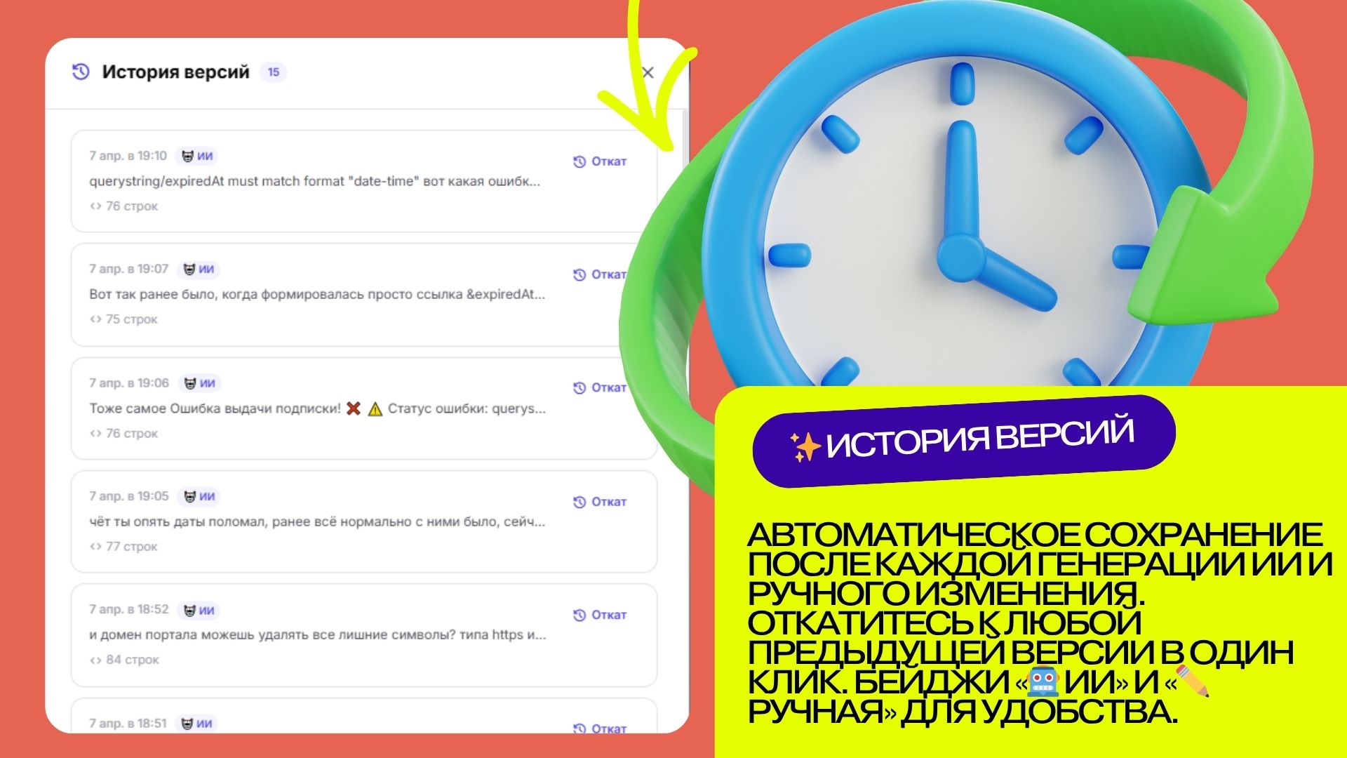 Каждая генерация и каждое ручное редактирование автоматически сохраняются как версия. Вы всегда можете: