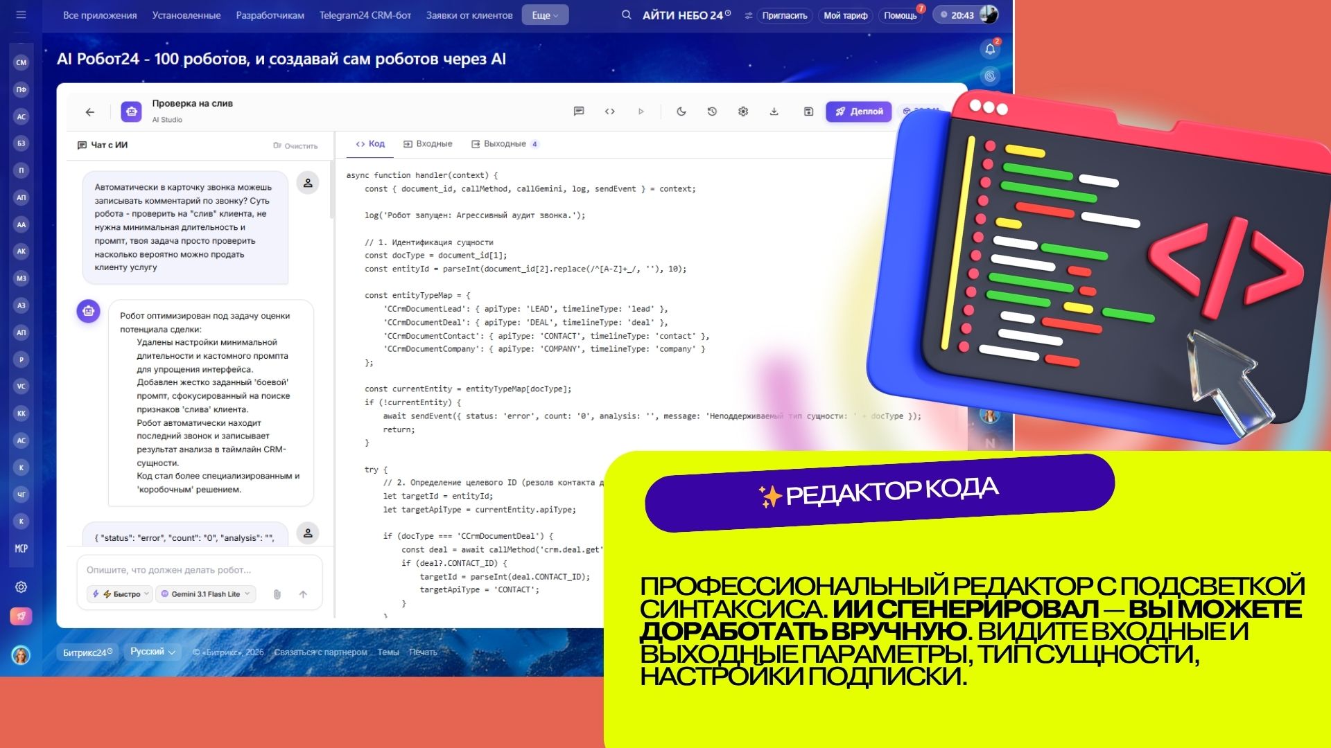 Это полноценная IDE (среда разработки) для роботов CRM, встроенная прямо в ваш портал. Вместо того чтобы нанимать программиста и ждать неделями, вы описываете задачу человеческим языком — а AI генерирует полный код обработчика, определяет входные и выходные параметры, и позволяет мгновенно зарегистрировать робота на портале.