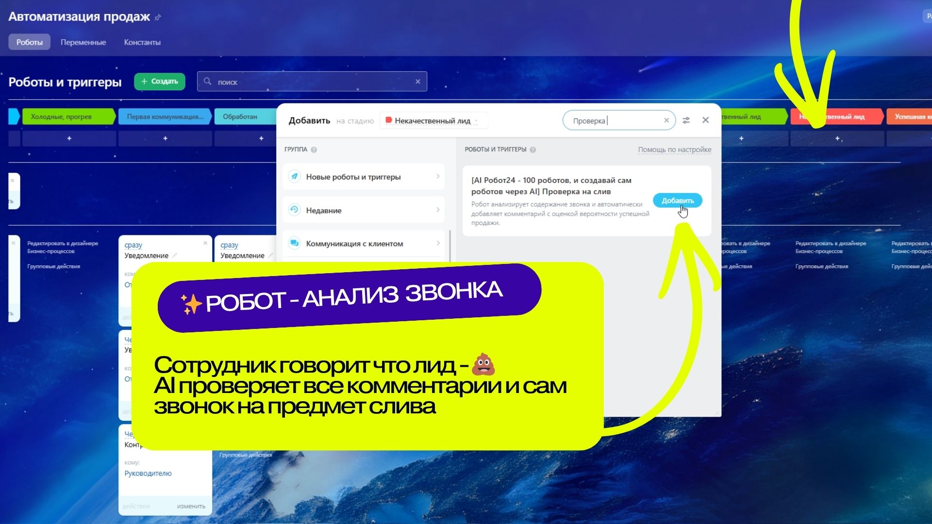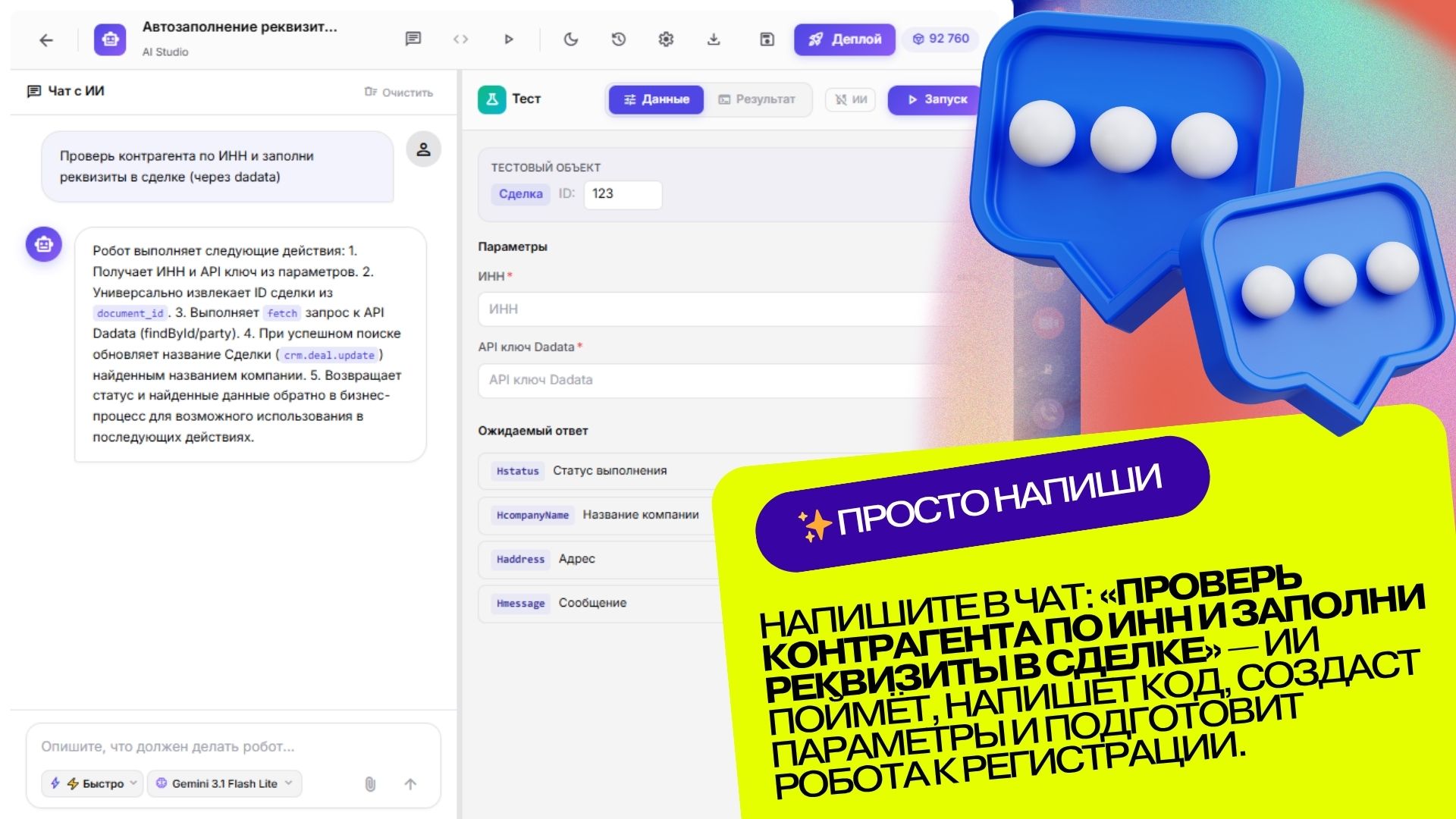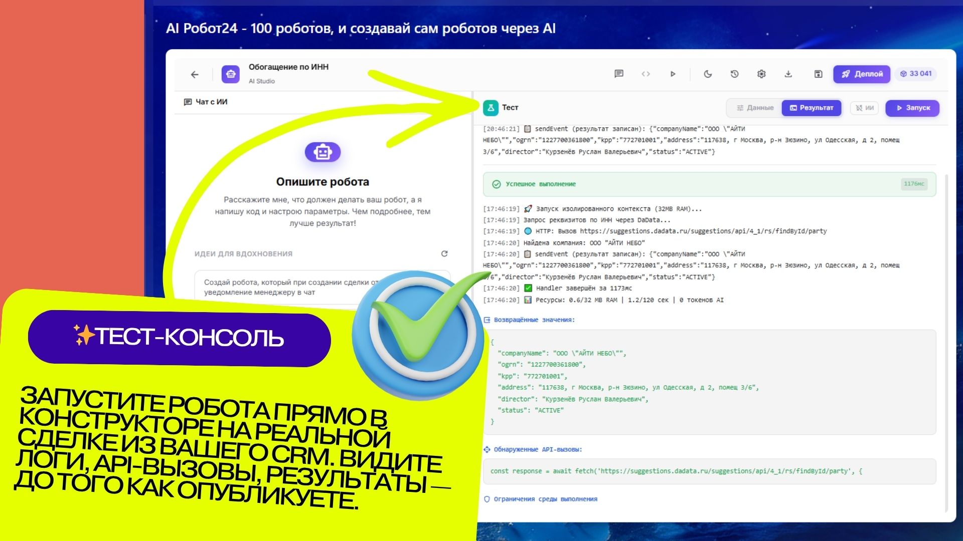- Тестовая консоль (справа) — запускайте робота прямо в приложении, тестируйте на реальных данных CRM и анализируйте результаты.