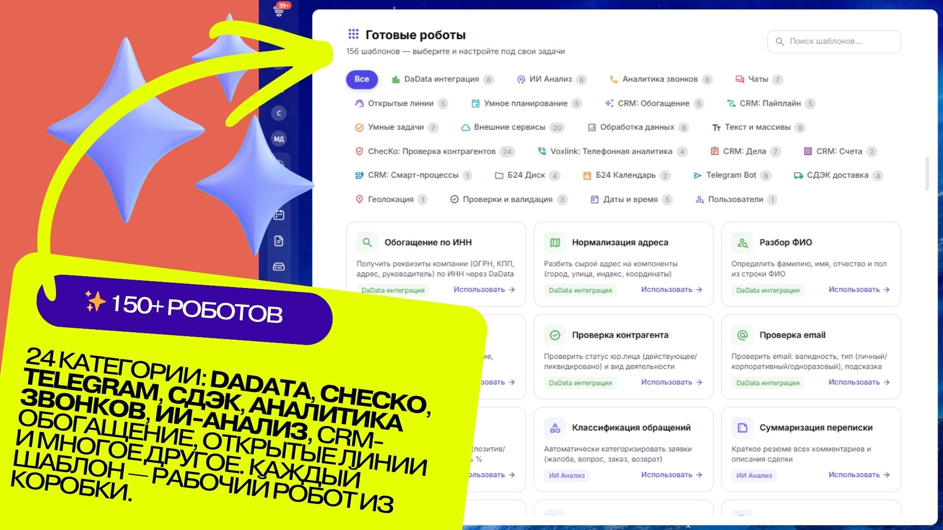 Не хотите описывать задачу с нуля? Выберите из обширной библиотеки готовых роботов по категориям: