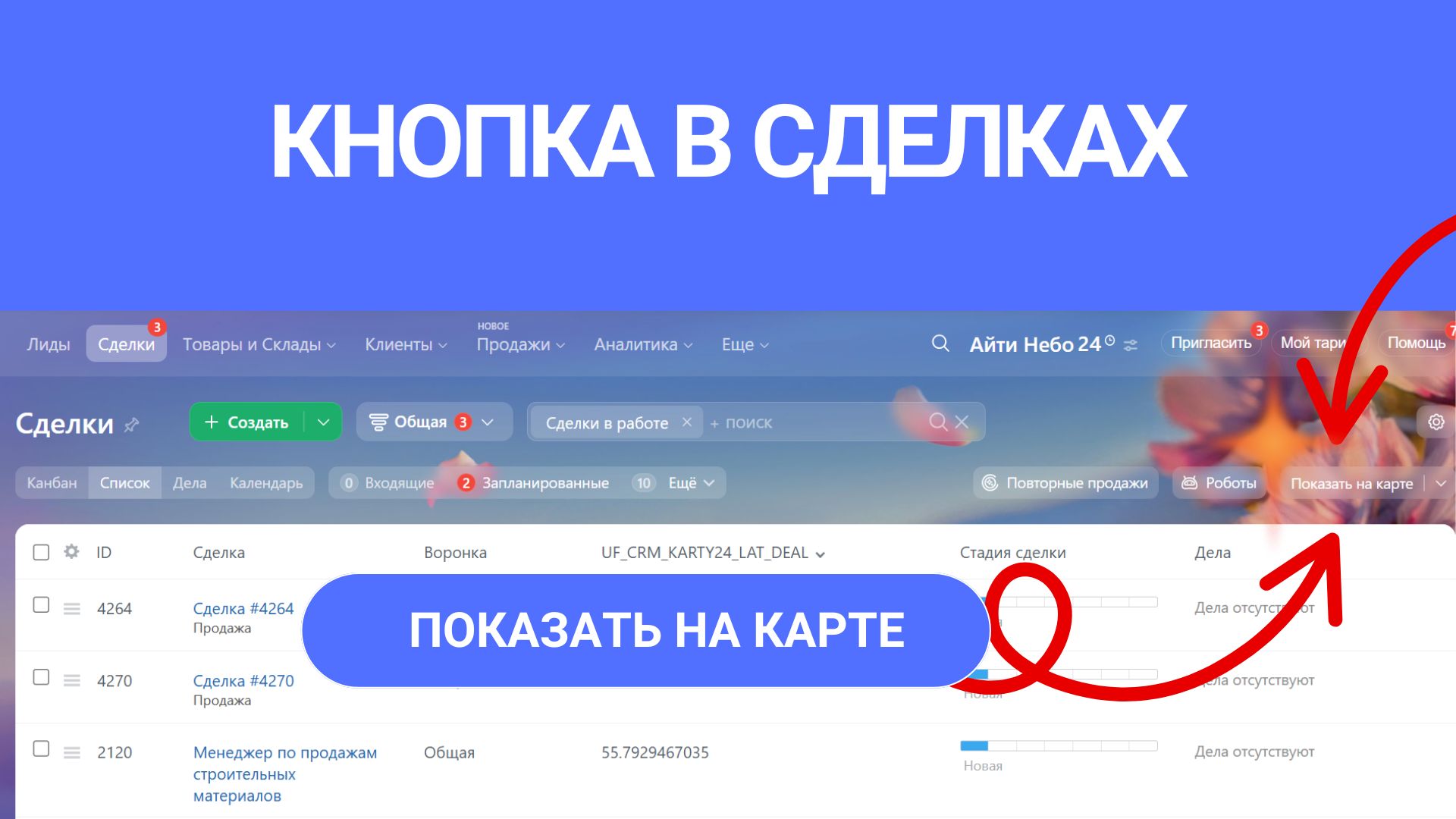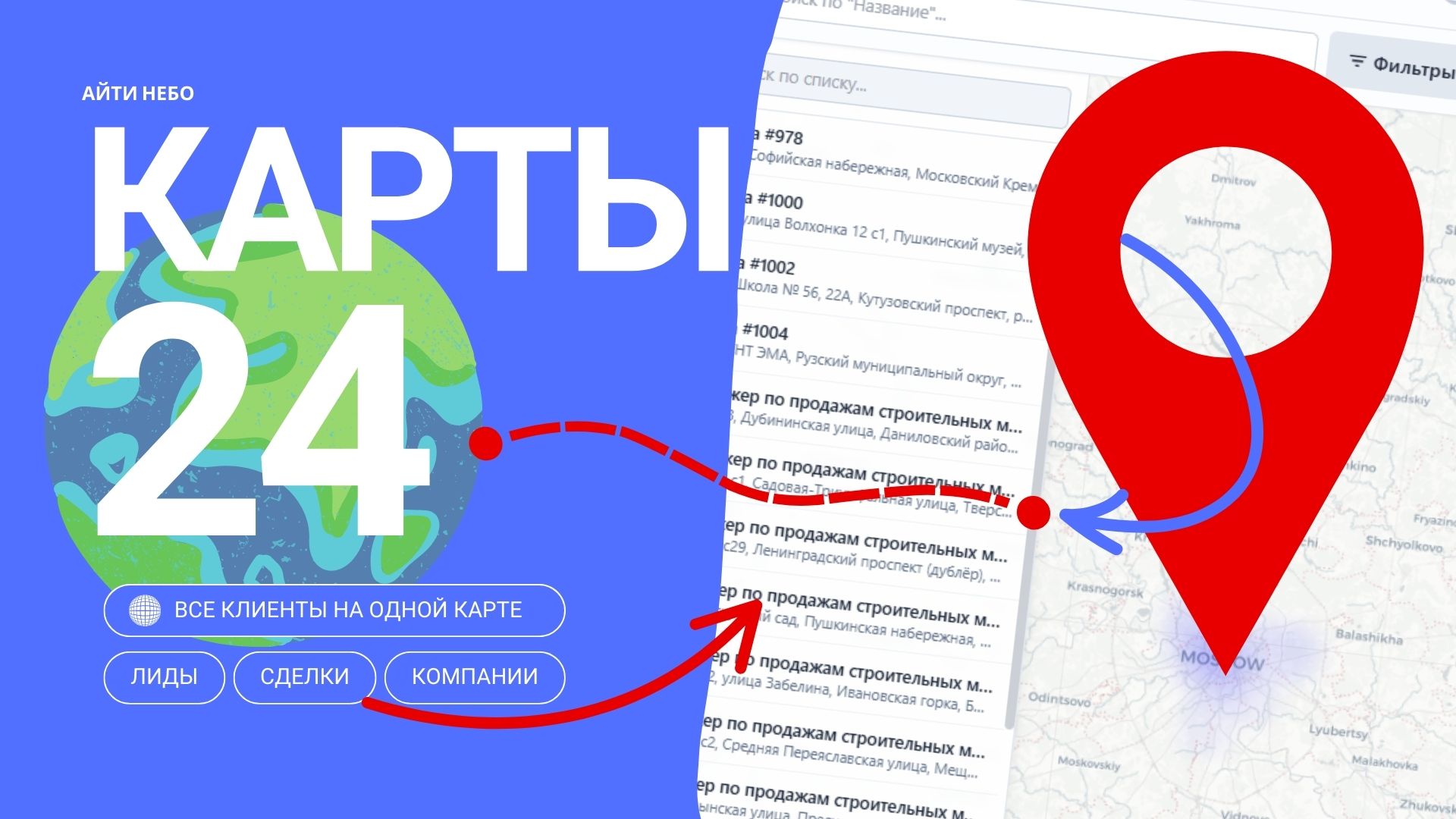Карты24 — это уникальное приложение для Битрикс24, которое поможет вам визуализировать все данные CRM на карте. Отображайте контакты, компании, лиды и сделки, планируйте маршруты и оптимизируйте логистику. Забудьте о рутине и принимайте быстрые и точные решения, управляя продажами и выездными сотрудниками.