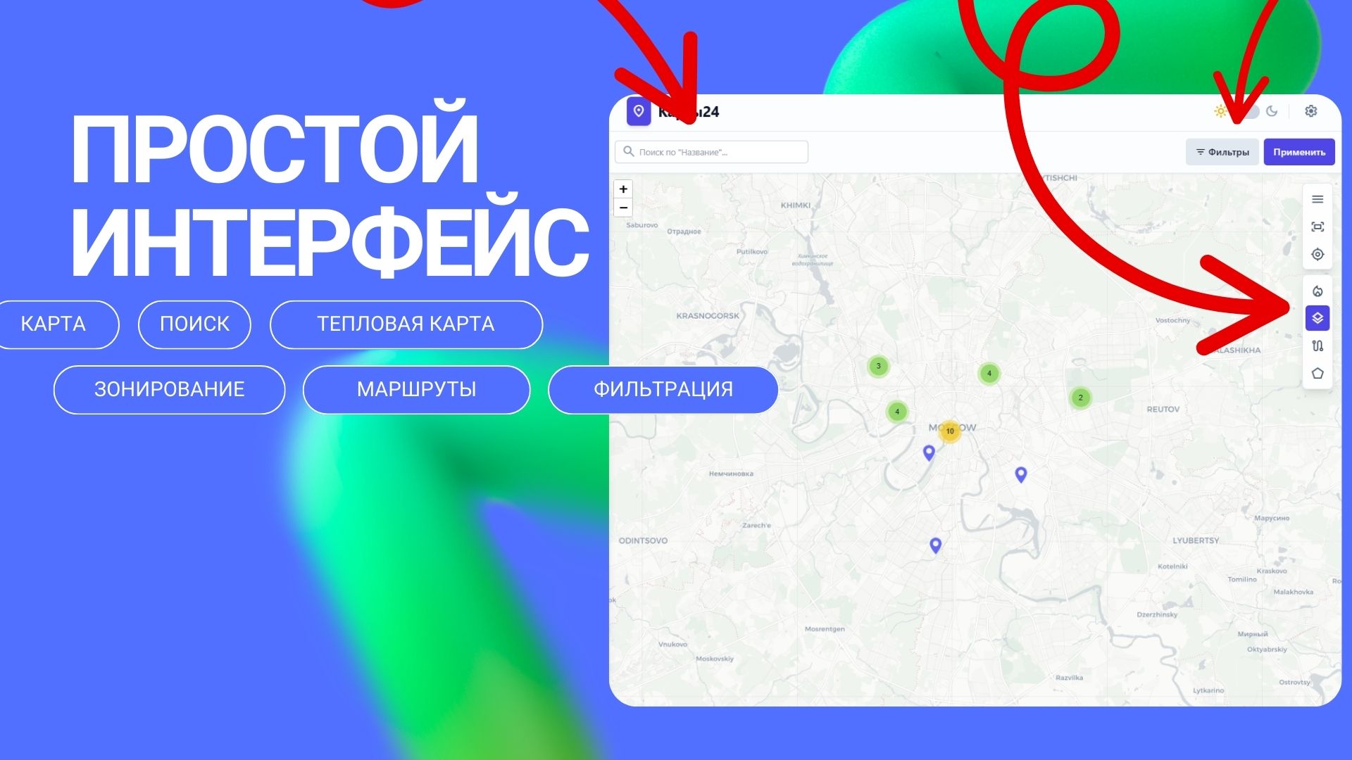 Простой интерфейс. Легко ориентируйтесь в приложении с помощью интуитивно понятных кнопок. Используйте поиск, тепловые карты, зонирование, фильтрацию и построение маршрутов.