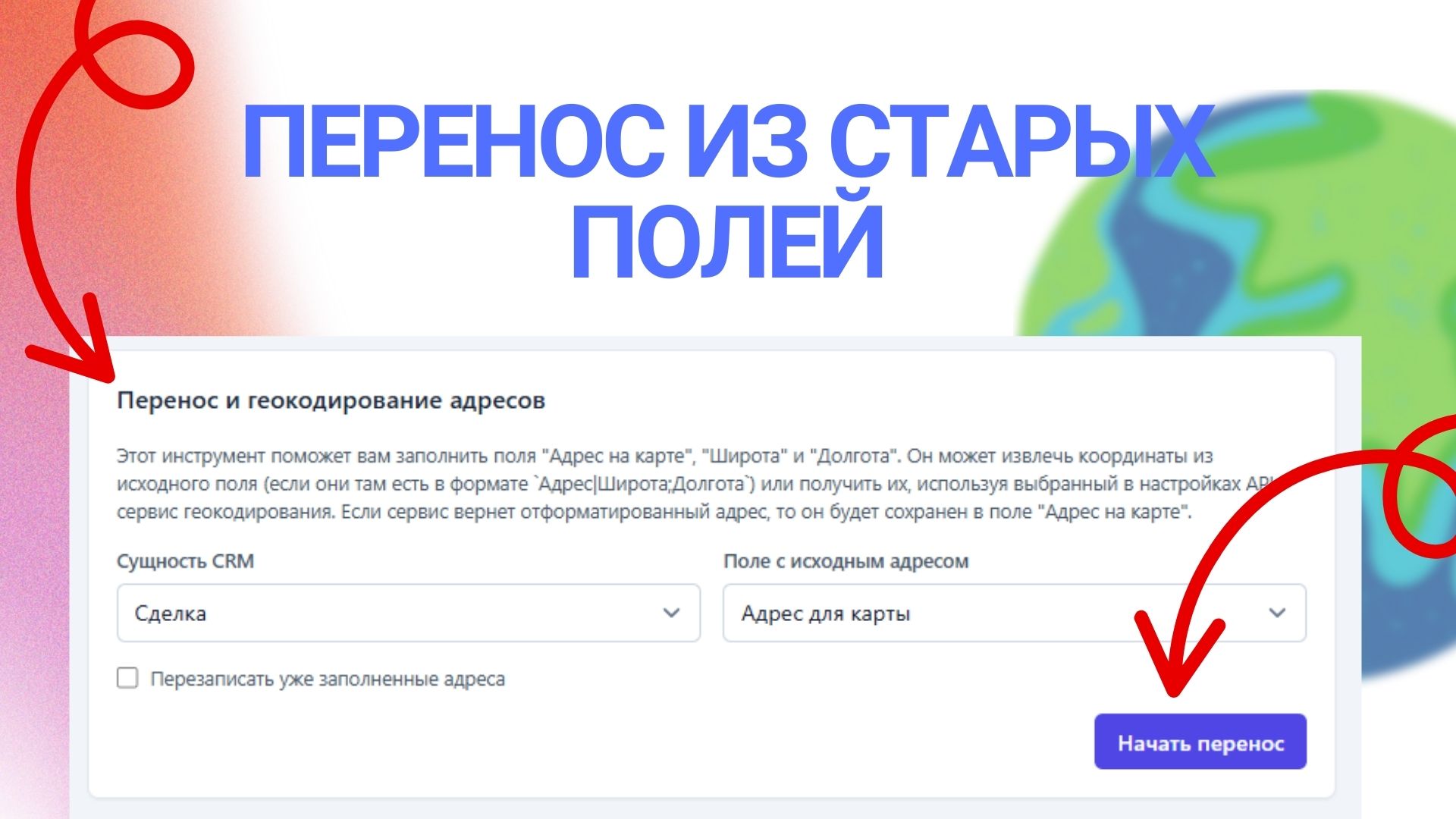 Поле с картой. Добавьте поле с картой прямо в карточку CRM, чтобы работать с адресом, не покидая сделку или контакт. Просто введите или кликните на карте, чтобы получить адрес.