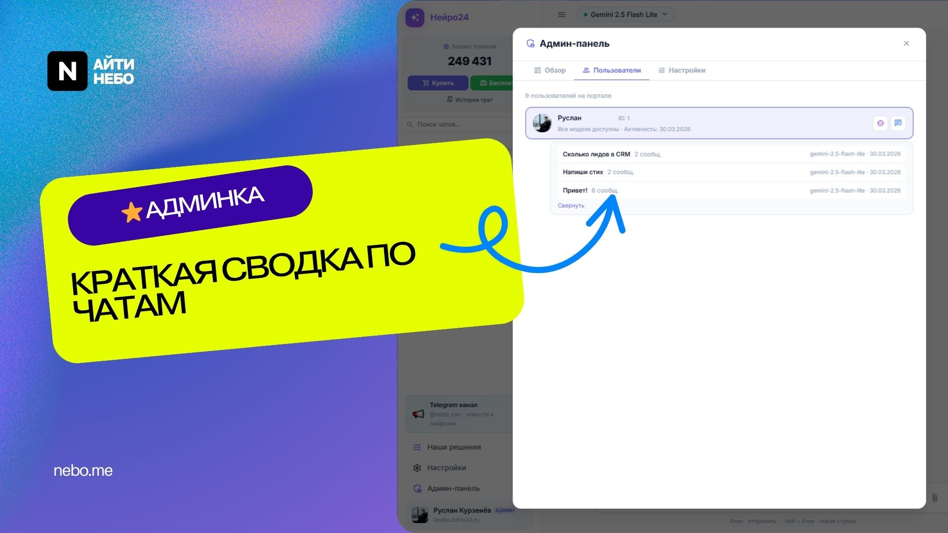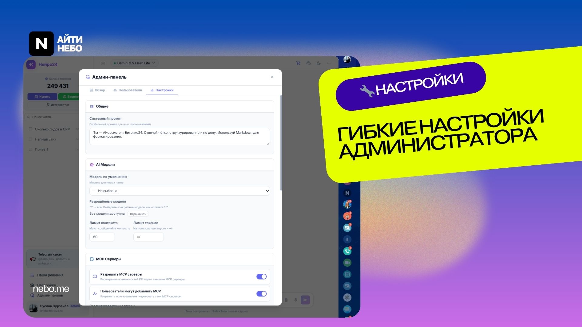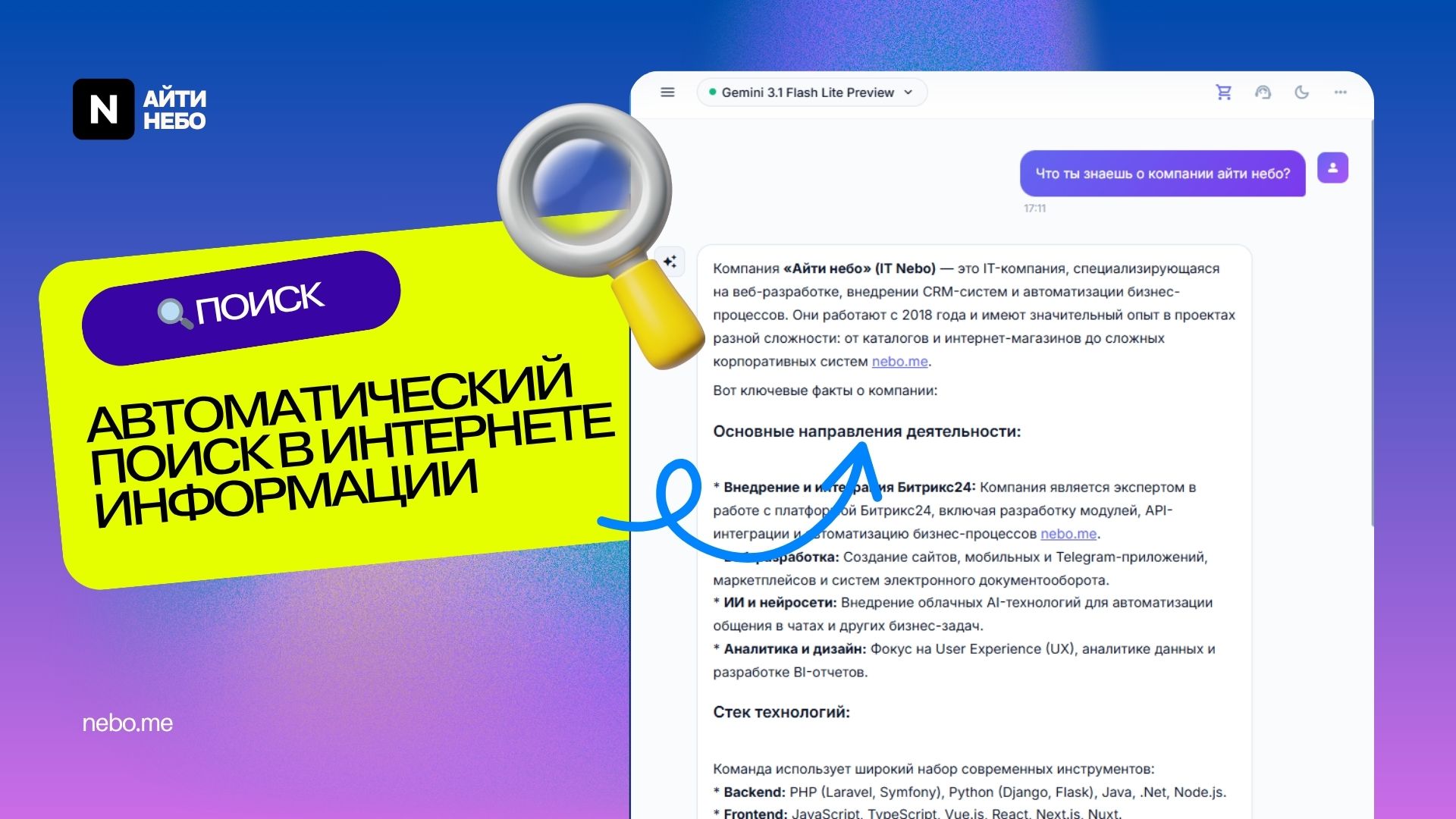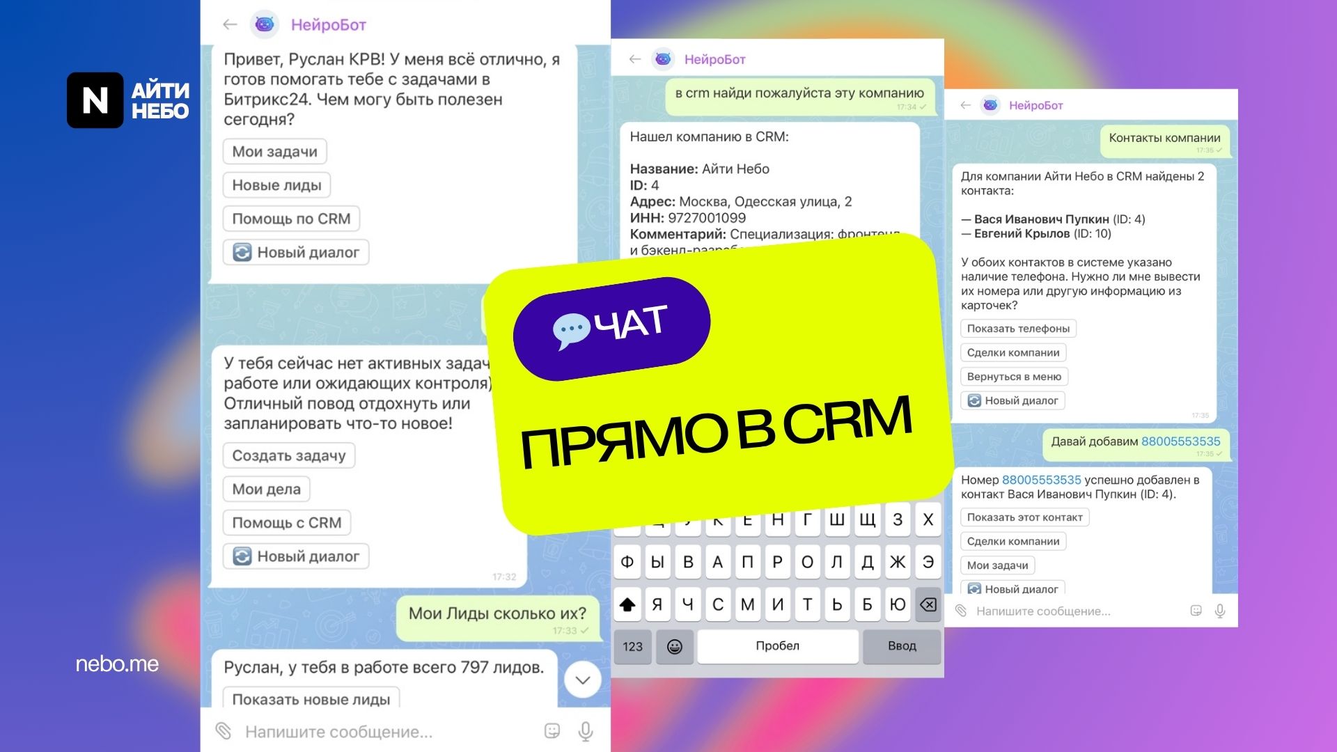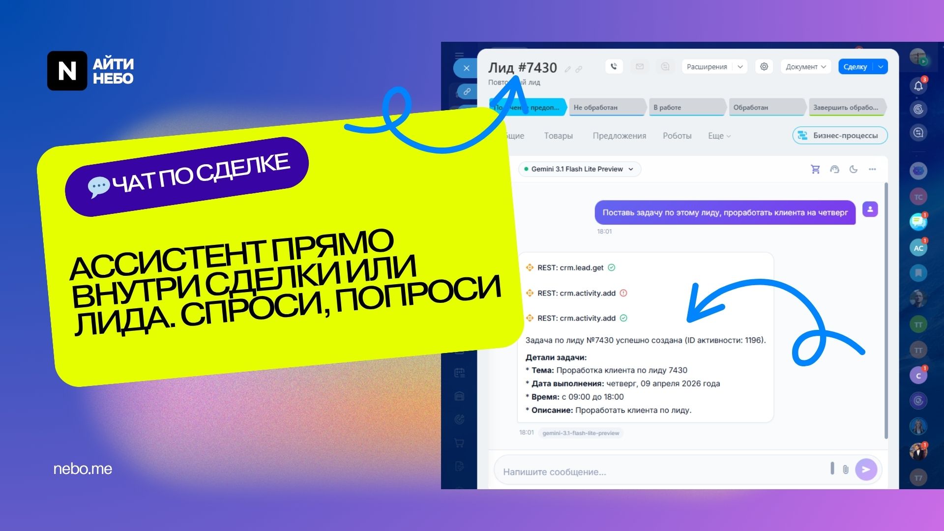 Это ваш персональный ИИ-помощник, который живёт прямо внутри CRM. Вы общаетесь с ним, как с коллегой, — а он сам находит нужные данные, вызывает REST API вашего портала и возвращает готовый результат. Без фильтров, без отчётов, без лишних кликов.