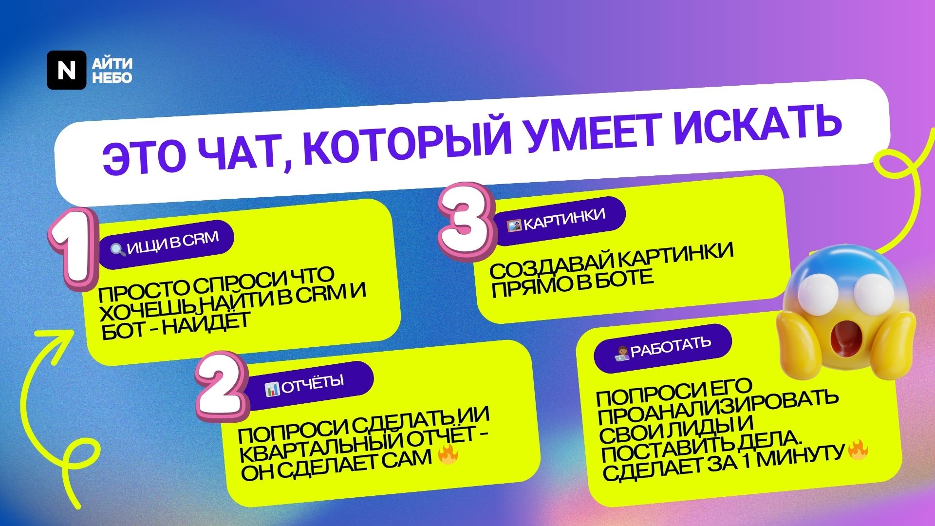 Просто напишите: «Сколько у нас открытых сделок на этой неделе?» — и через пару секунд получите точную цифру.