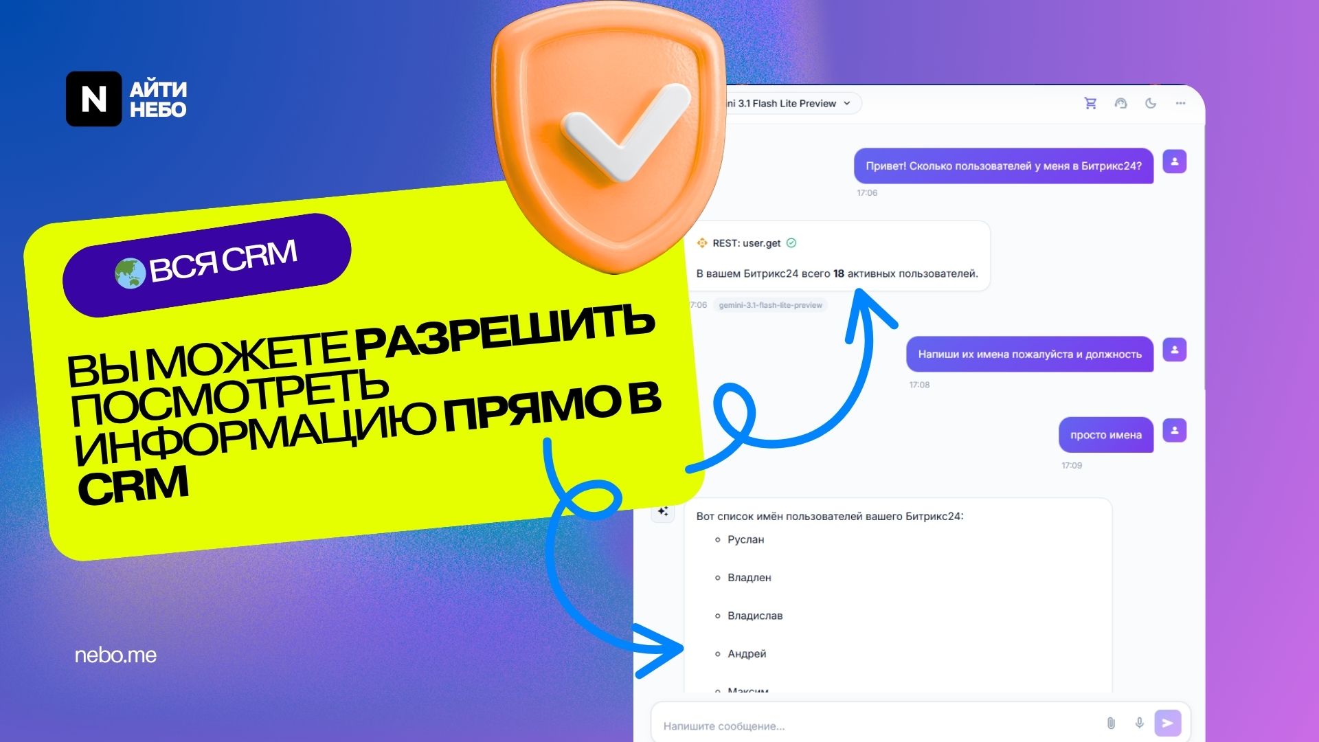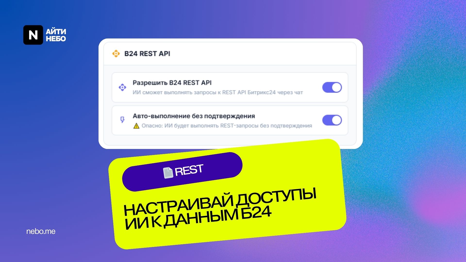 Приложение не хранит и не передаёт ваши данные на сторонние серверы. Каждый REST-запрос выполняется на стороне браузера пользователя через официальный BX24 JS SDK. ИИ видит только то, что разрешено текущими правами доступа.