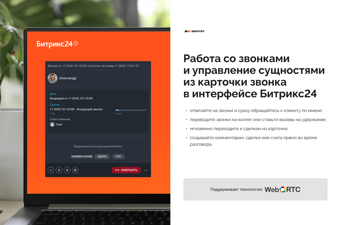 • Управляйте звонками через виджет: переводите звонки на коллег, ставьте звонок на удержание или отключайте микрофон при необходимости;