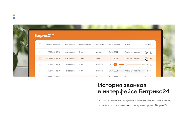 3. Все звонки автоматически сохраняются в карточке клиента с возможностью прослушивания записи звонка (при включенной опции в АТС).