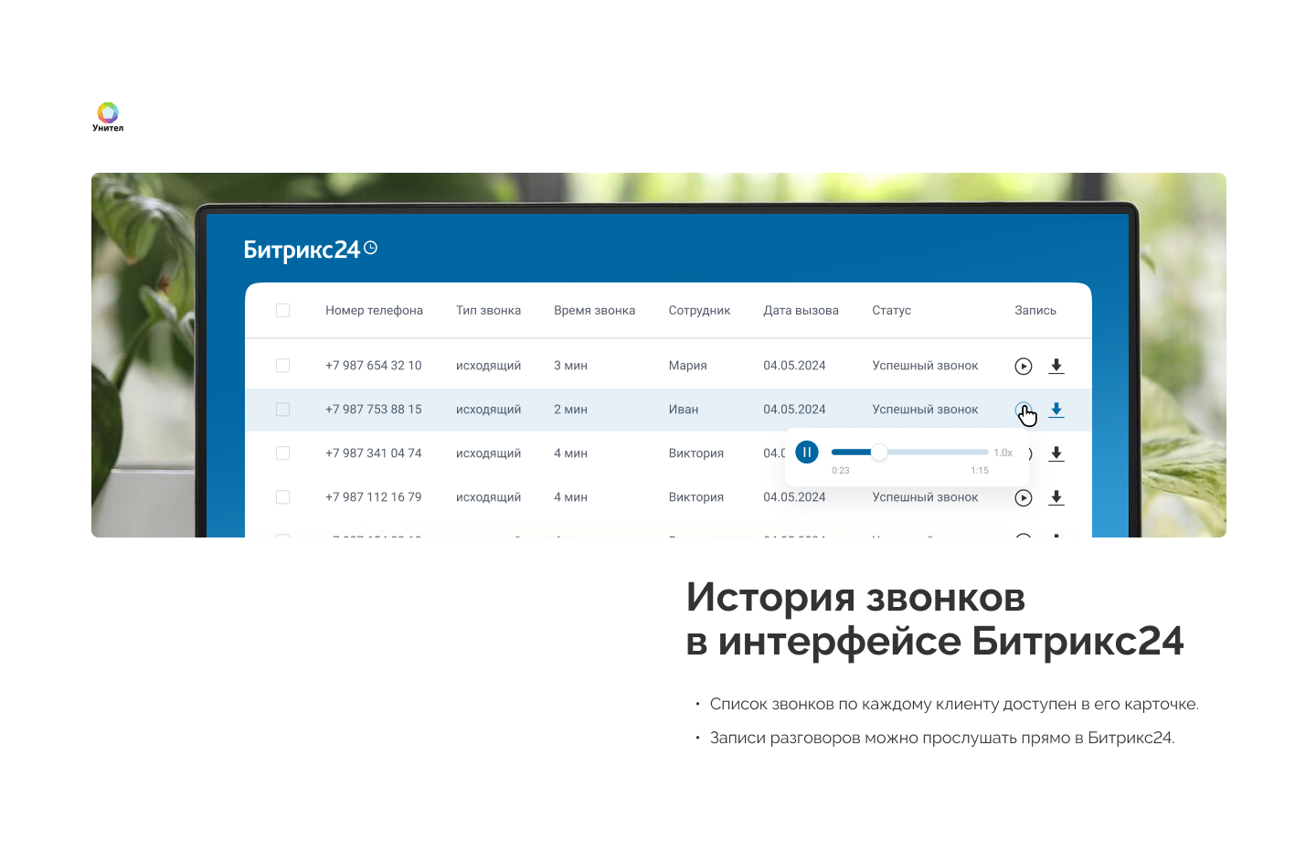 Возможности интеграции Виртуальной АТС Унител и Битрикс 24:
