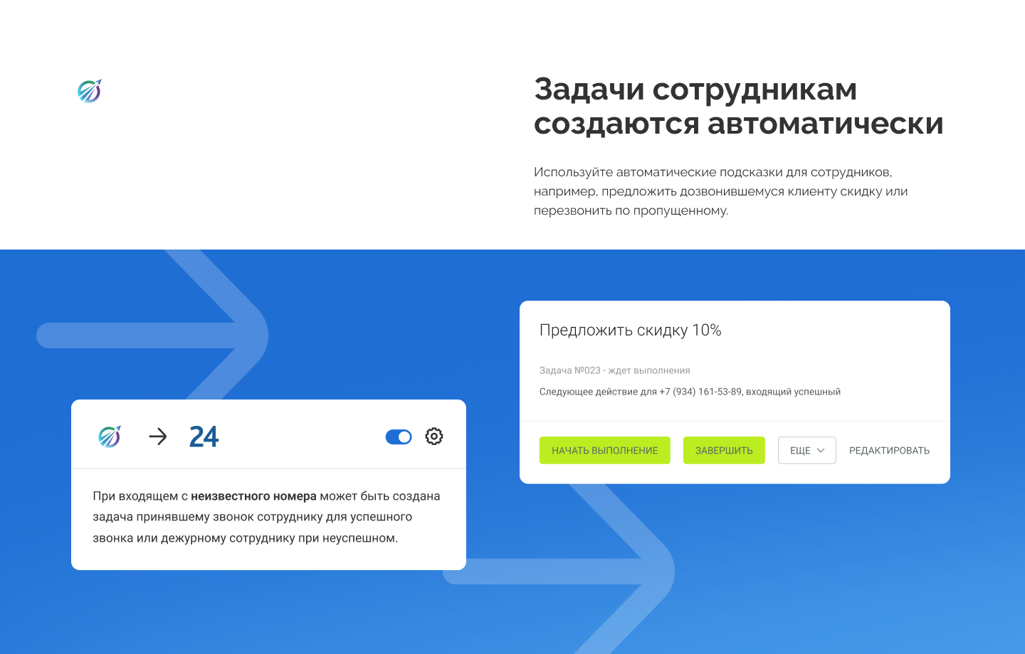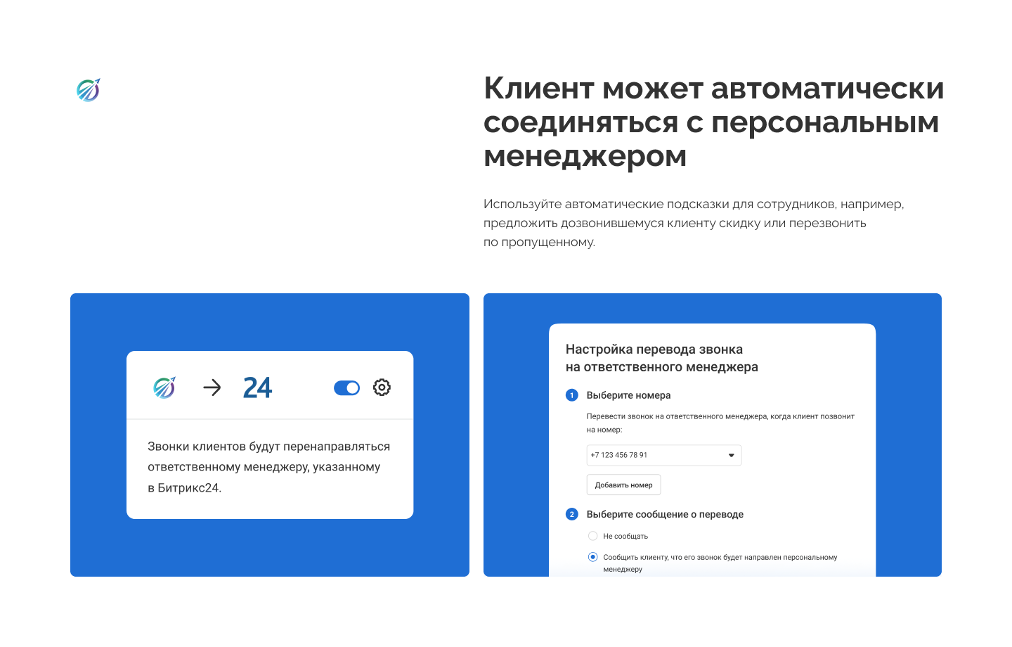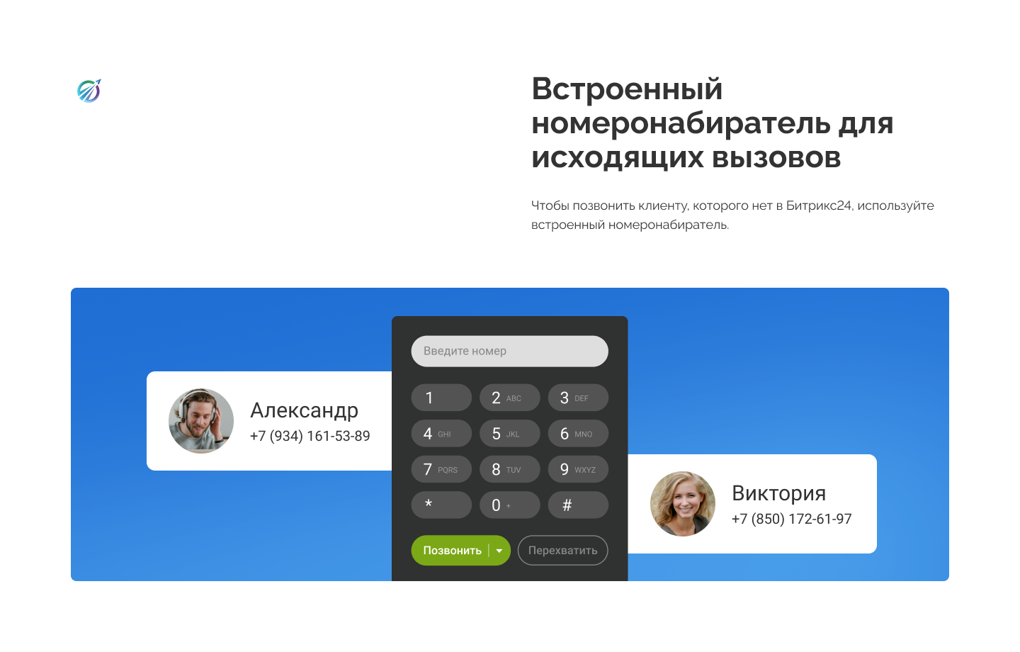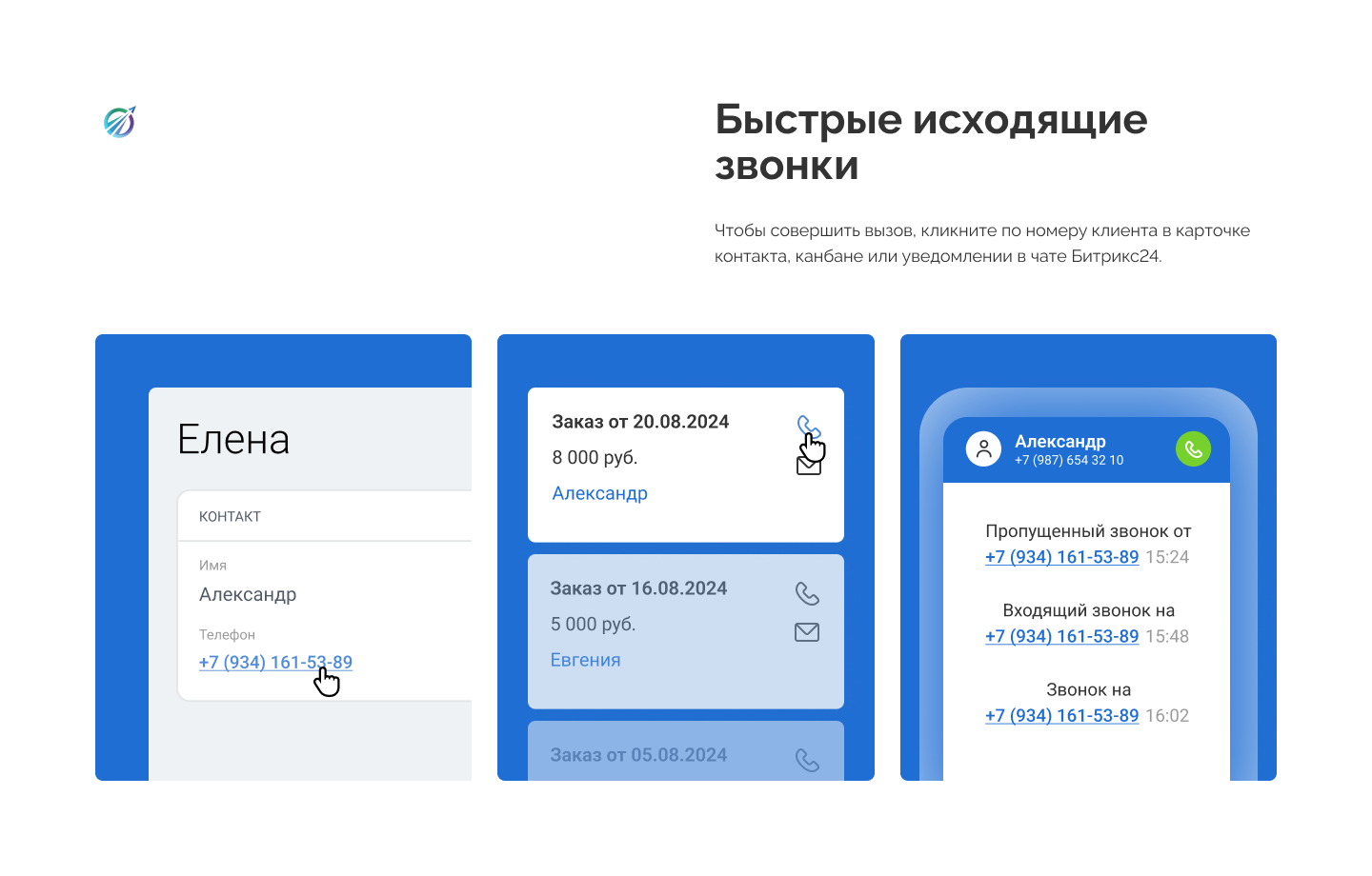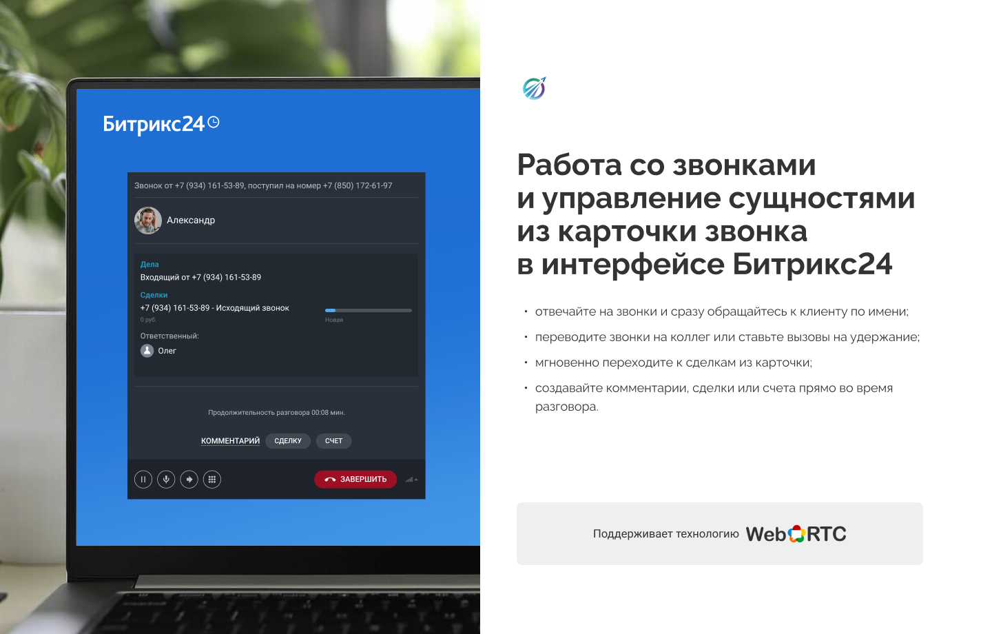 1. Всплывающая карточка клиента при входящем звонке;2. Исходящие звонки в один клик (поддержка WebRTC);