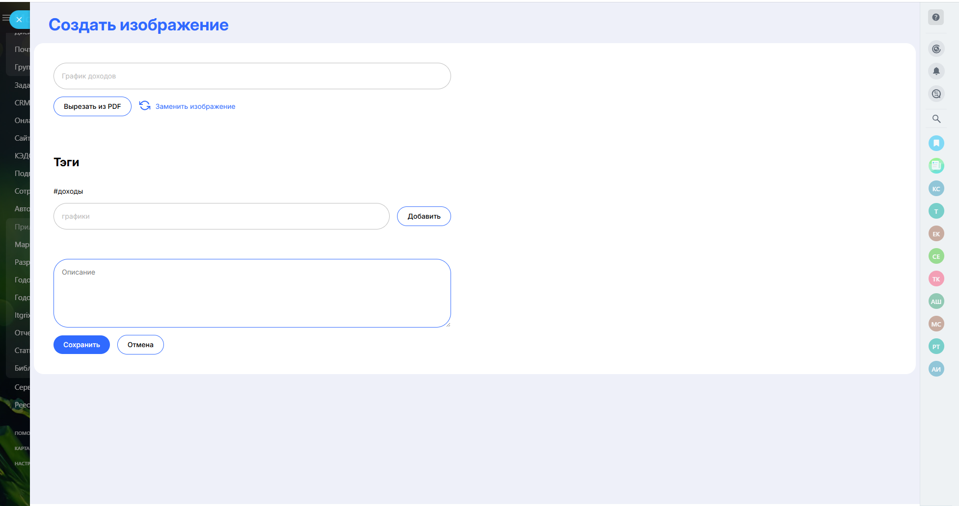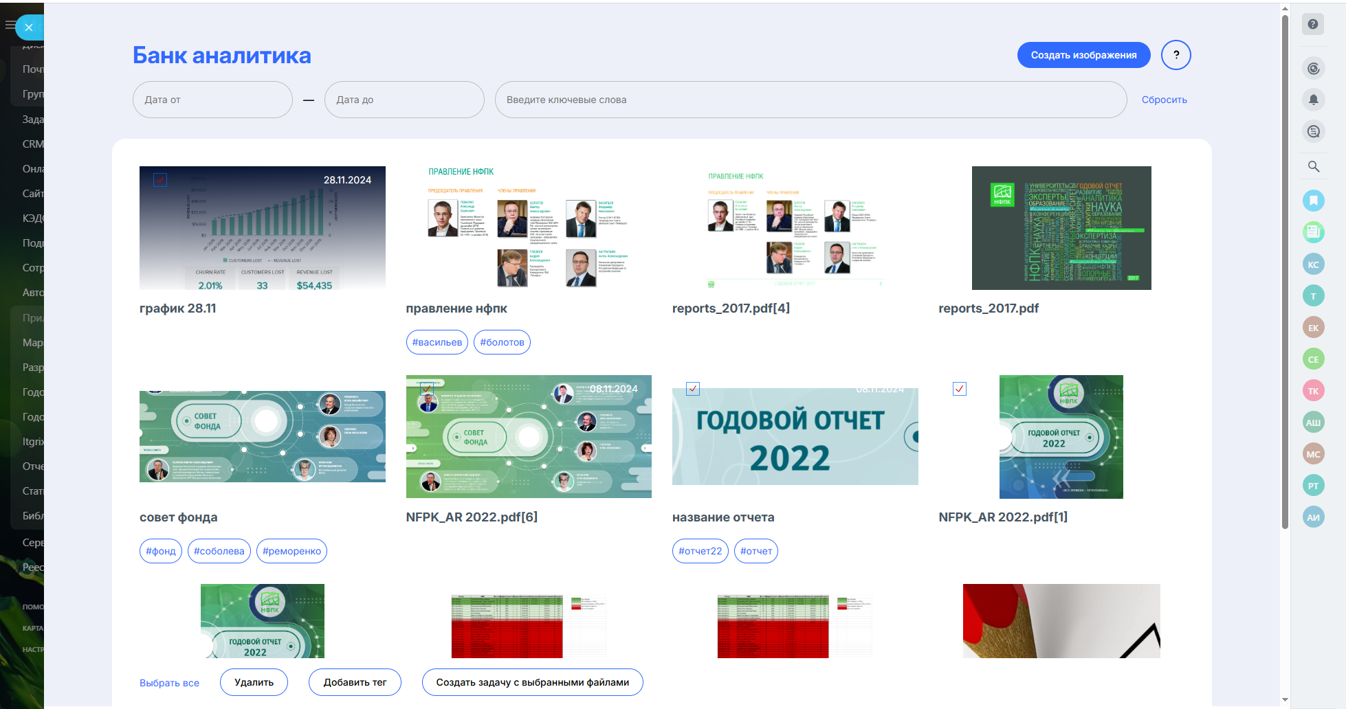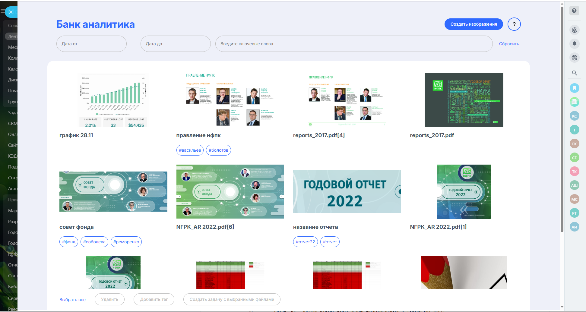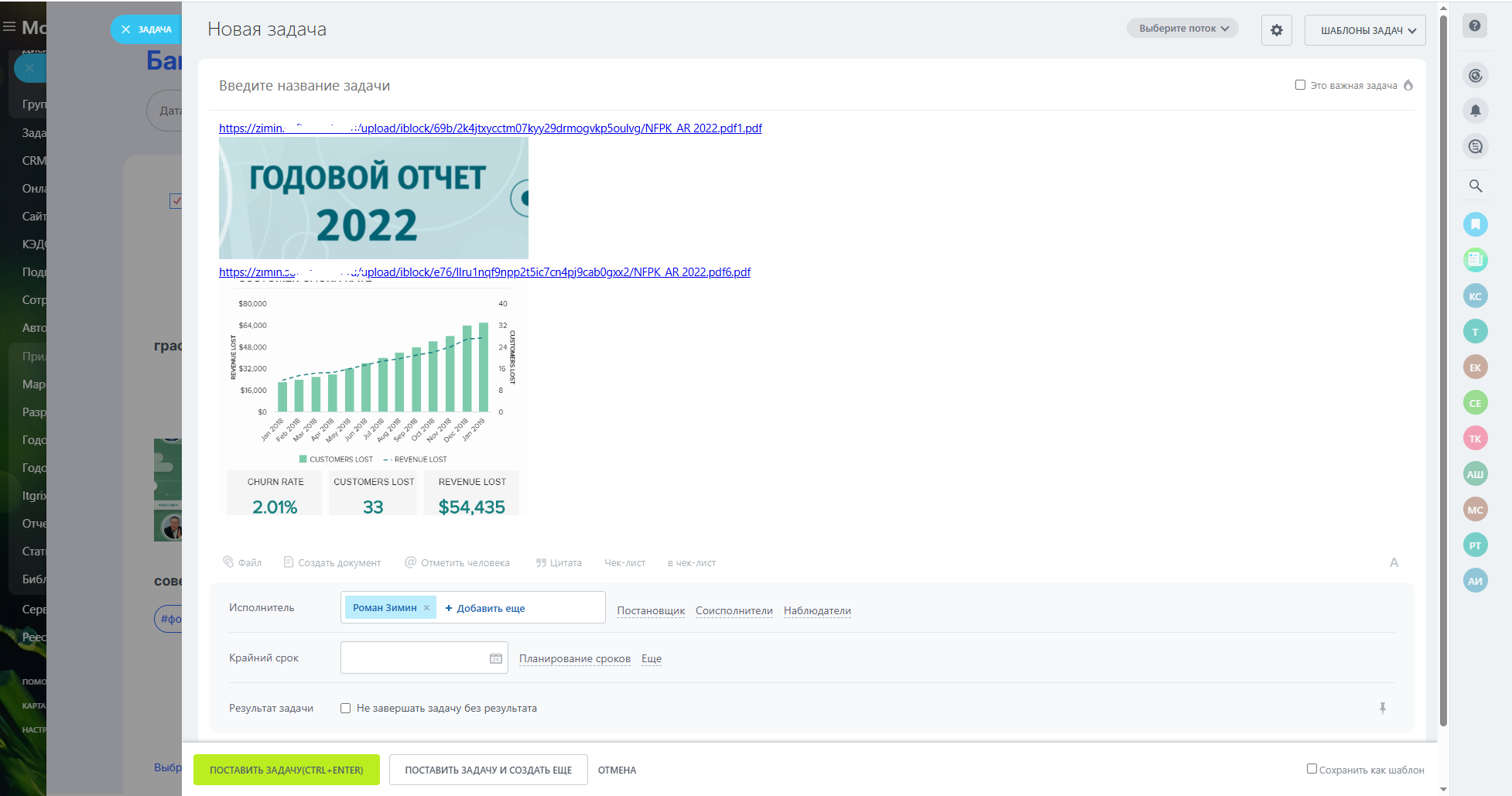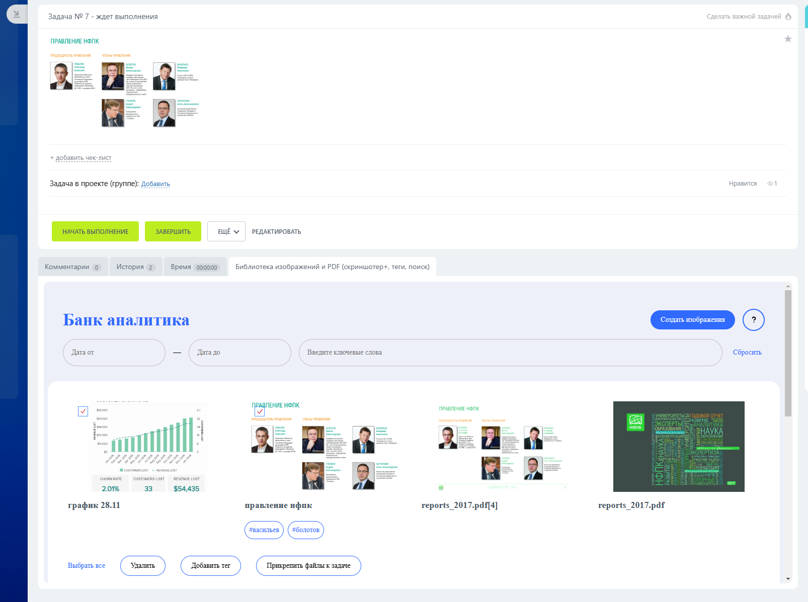 Быстро используйте сохраненные материалы для постановки задач сотруднику. Выберите подходящий график/изображение/pdf или сразу несколько, и в 1 клик вставьте их в новую Задачу, сопроводив описанием к ней.