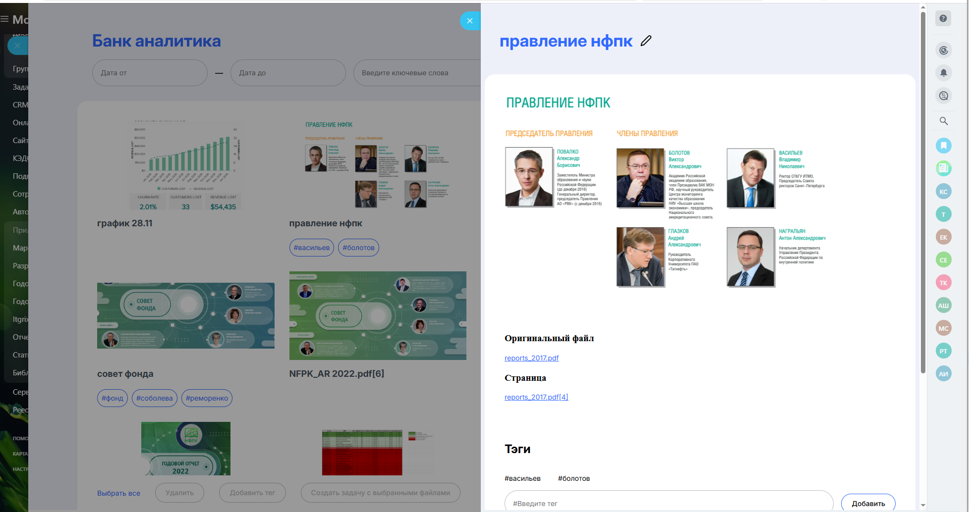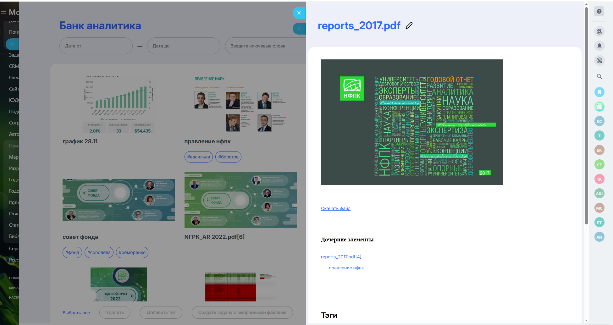 Преимущества:- Экономия времени: больше не нужно каждый раз искать нужные картинки, скриншоты или документы. Важные данные, презентации, прайсы, графики и визуализации быстро находятся с помощью поиска по тегам, описанию, названию файла, дате.