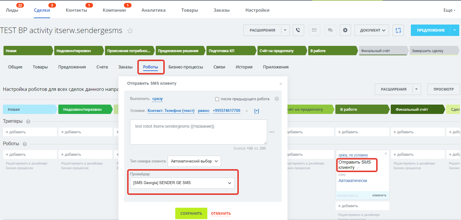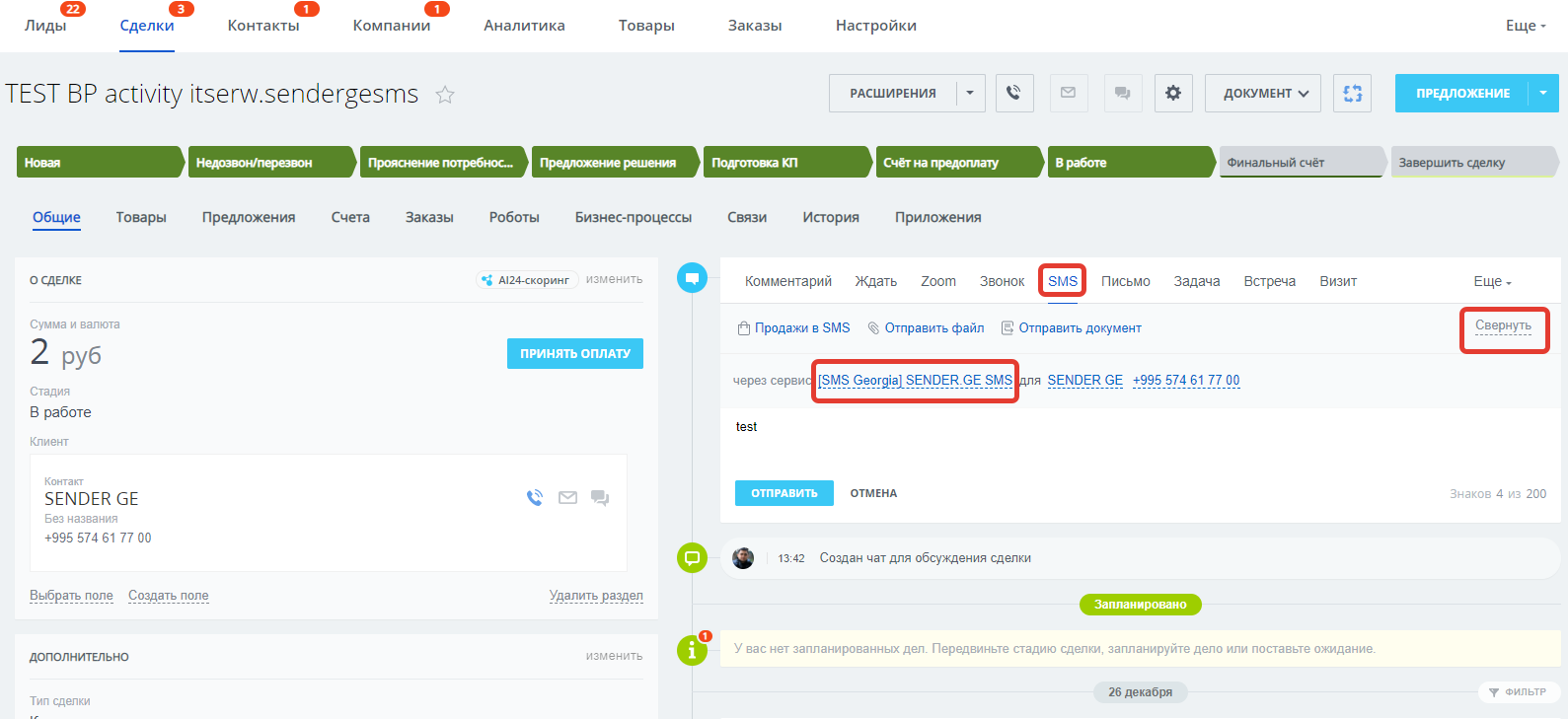 Приложение позволяет отсылать SMS через оператора SENDER.GE из CRM сущностей: сделок, роботов, бизнес-процессов и CRM маркетинг (SMS рассылки по Грузии).