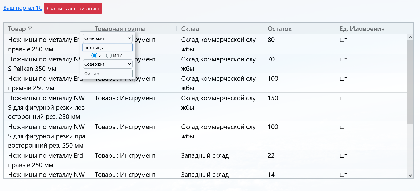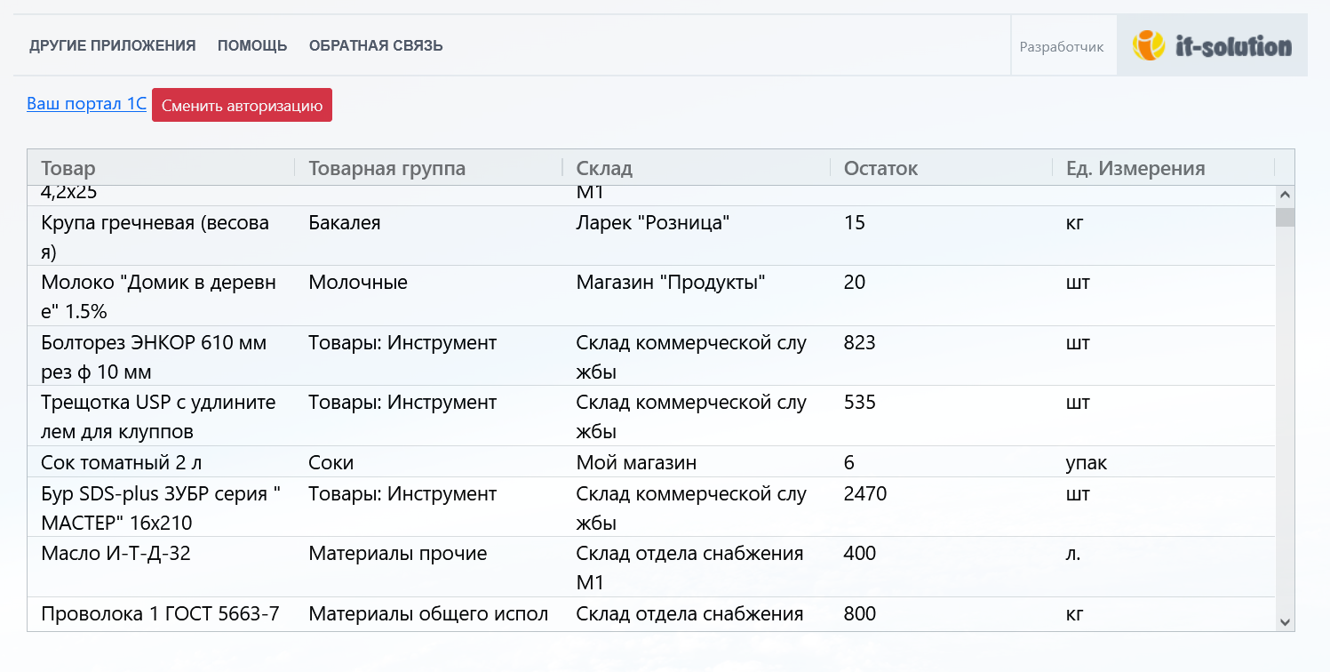 Приложение получит данные об остатках в 1С и выведет в таблицу данные: