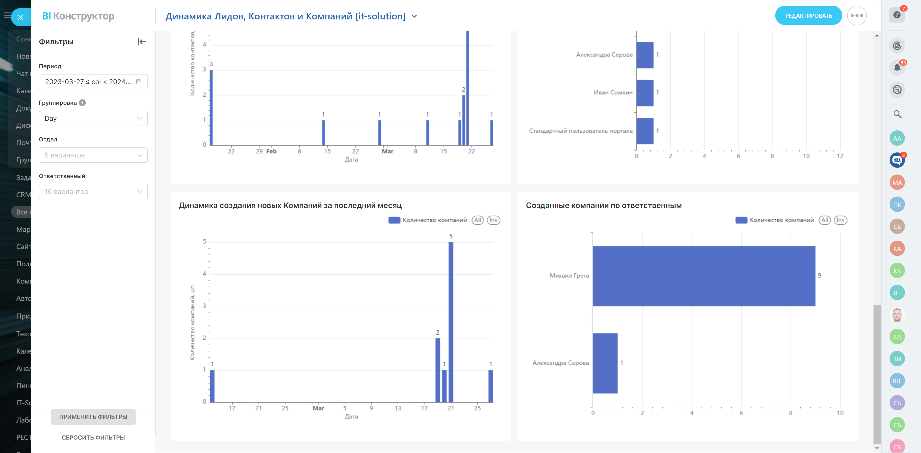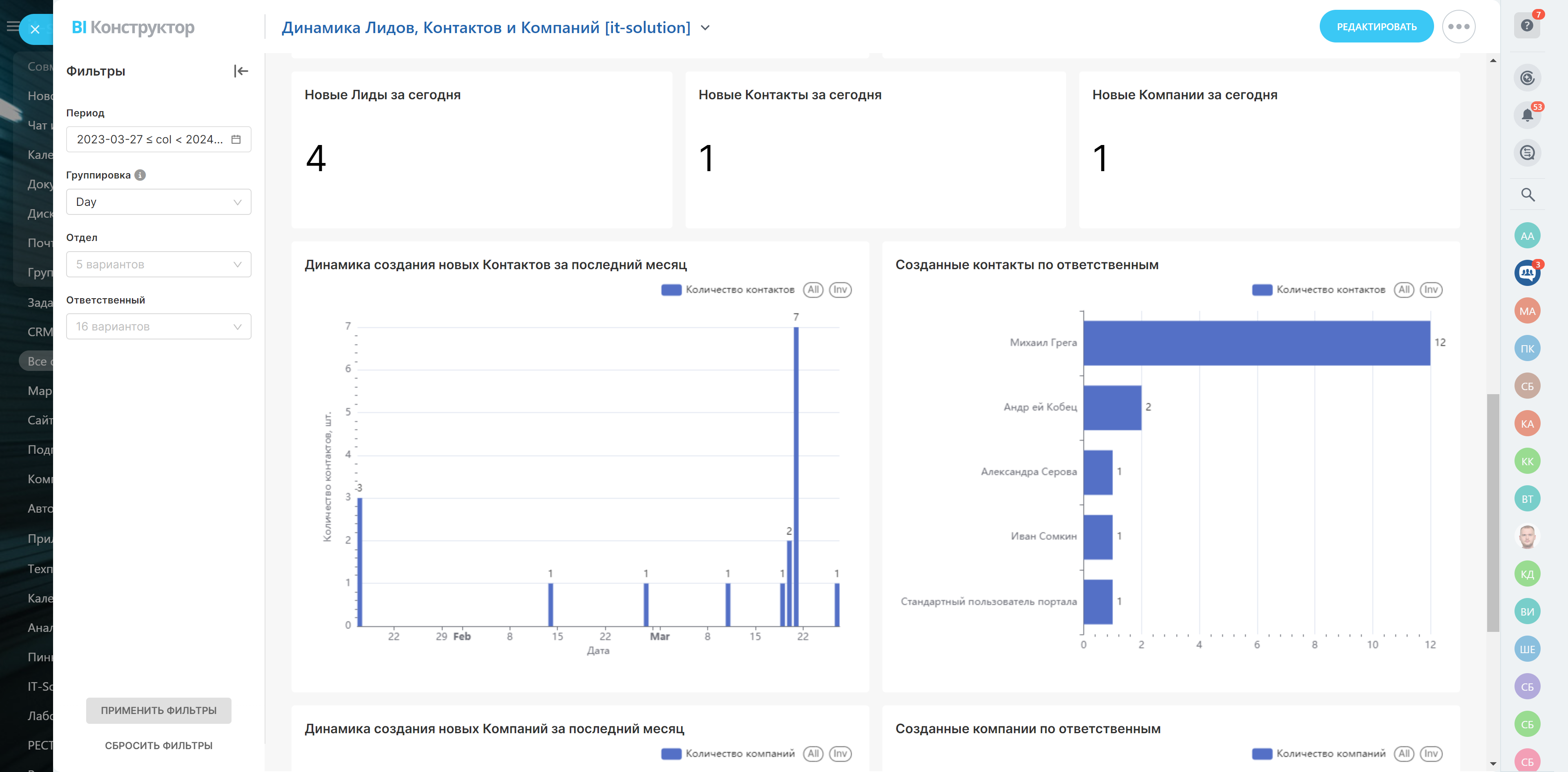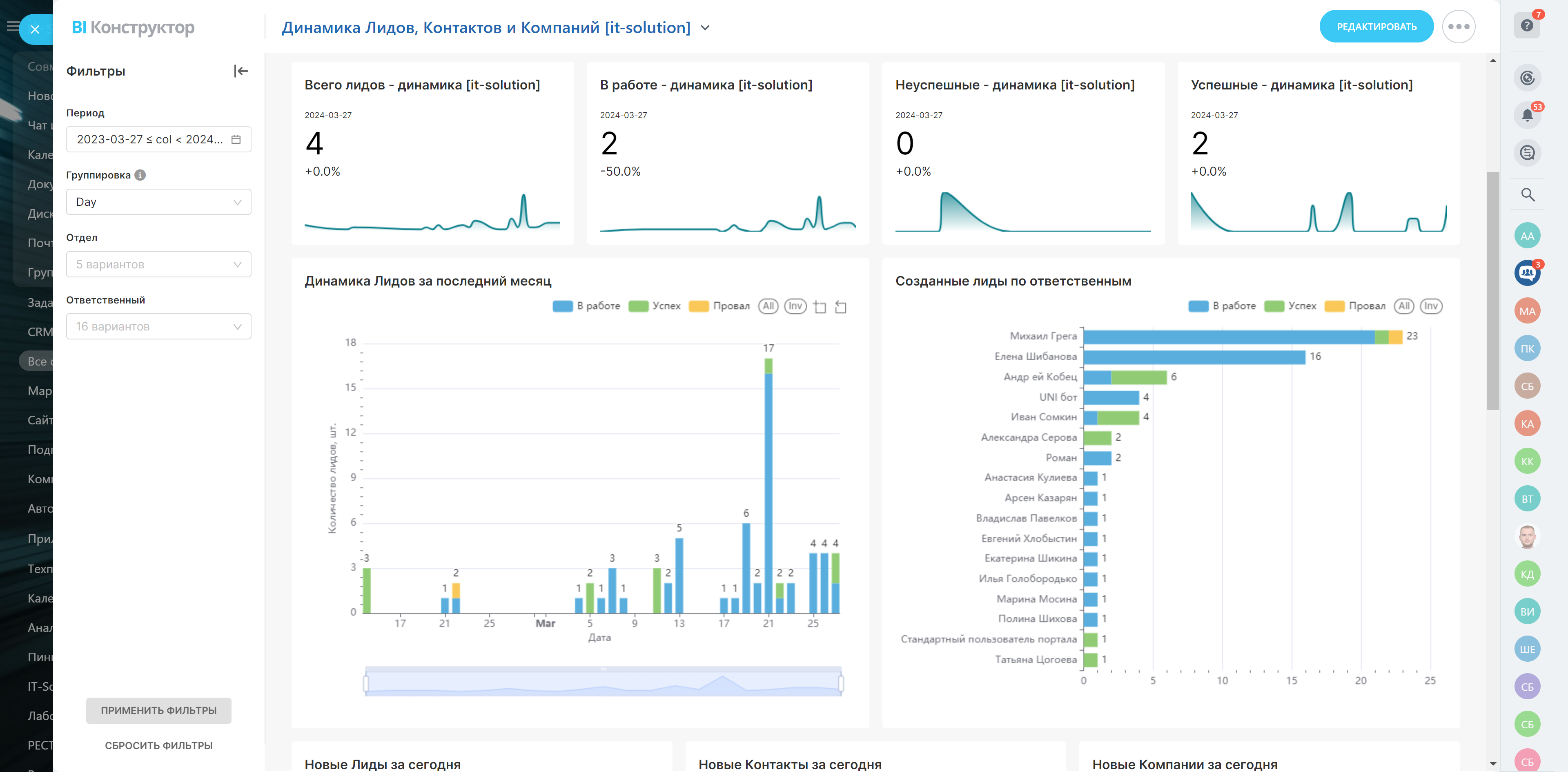 Динамика Лидов, Контактов и Компаний — отчет, который поможет оценить генерацию и обработку лидов, контактов и компаний за выбранный период. Вам не придется искать данные в отдельных разделах Битрикс24 и самостоятельно формировать отчет.