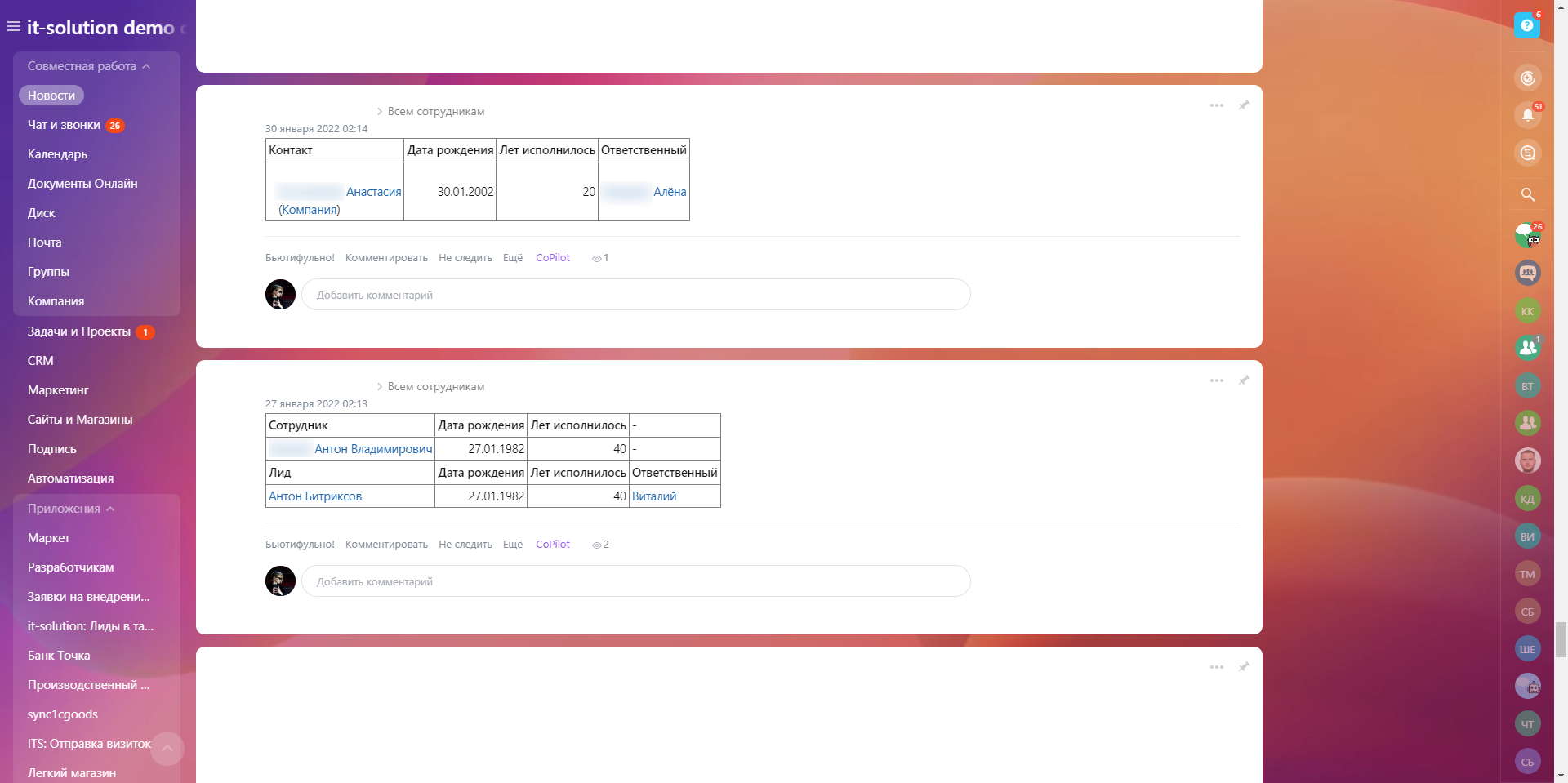 Каждую ночь приложение будет обновлять данные о днях рождения ваших сотрудников/Лидов/контактов/компаний и выставлять в виде таблицы в Живую Ленту. То есть, перед тем как начать рабочий день, Вы всегда будете знать, кого Вам надо поздравить с Днем рождения!