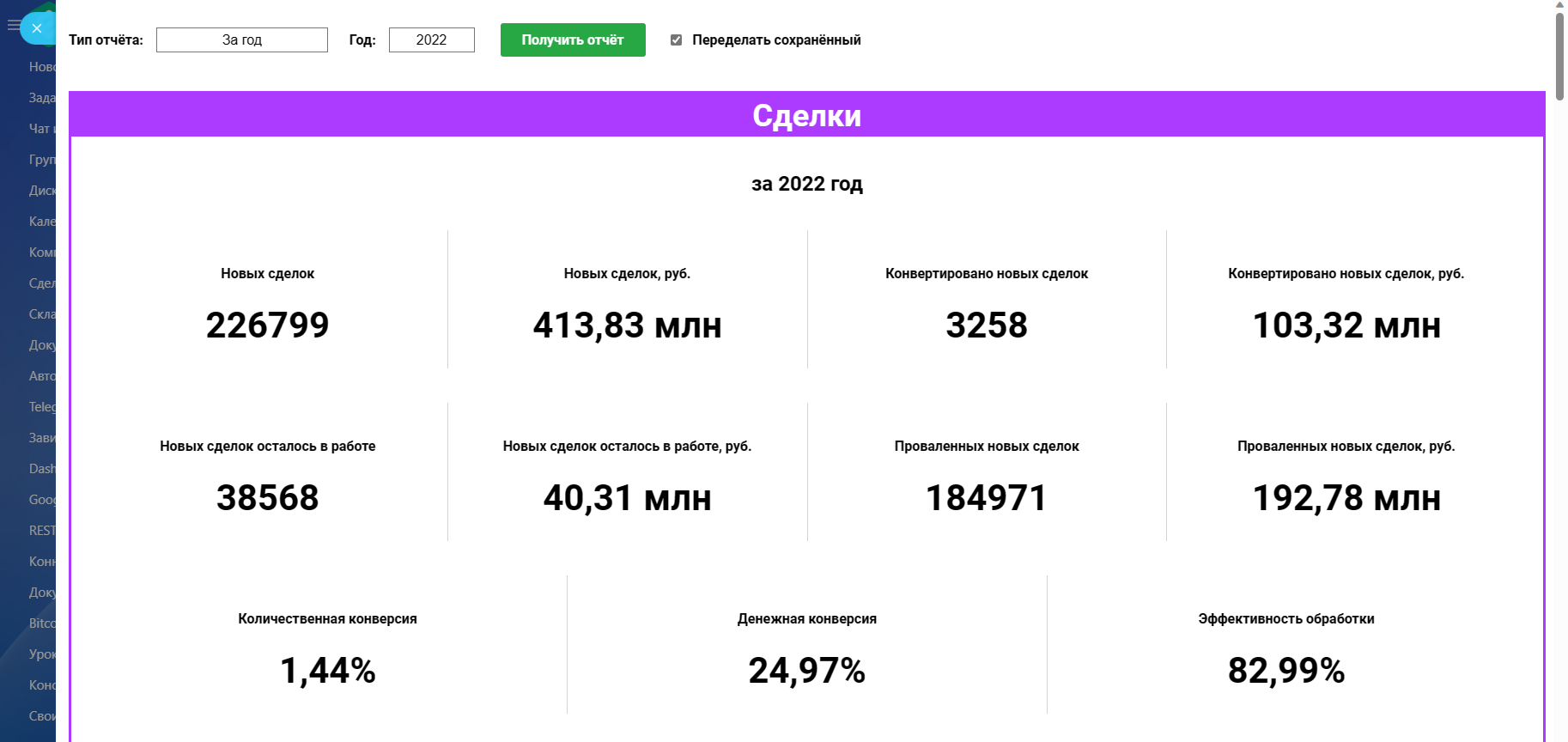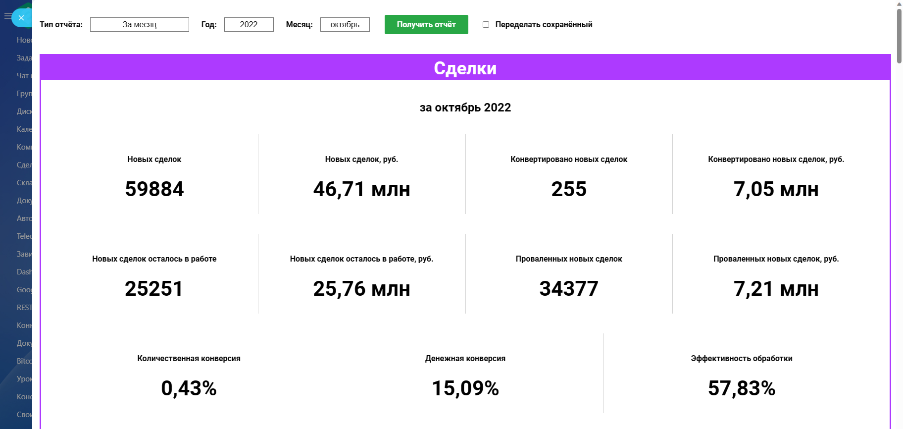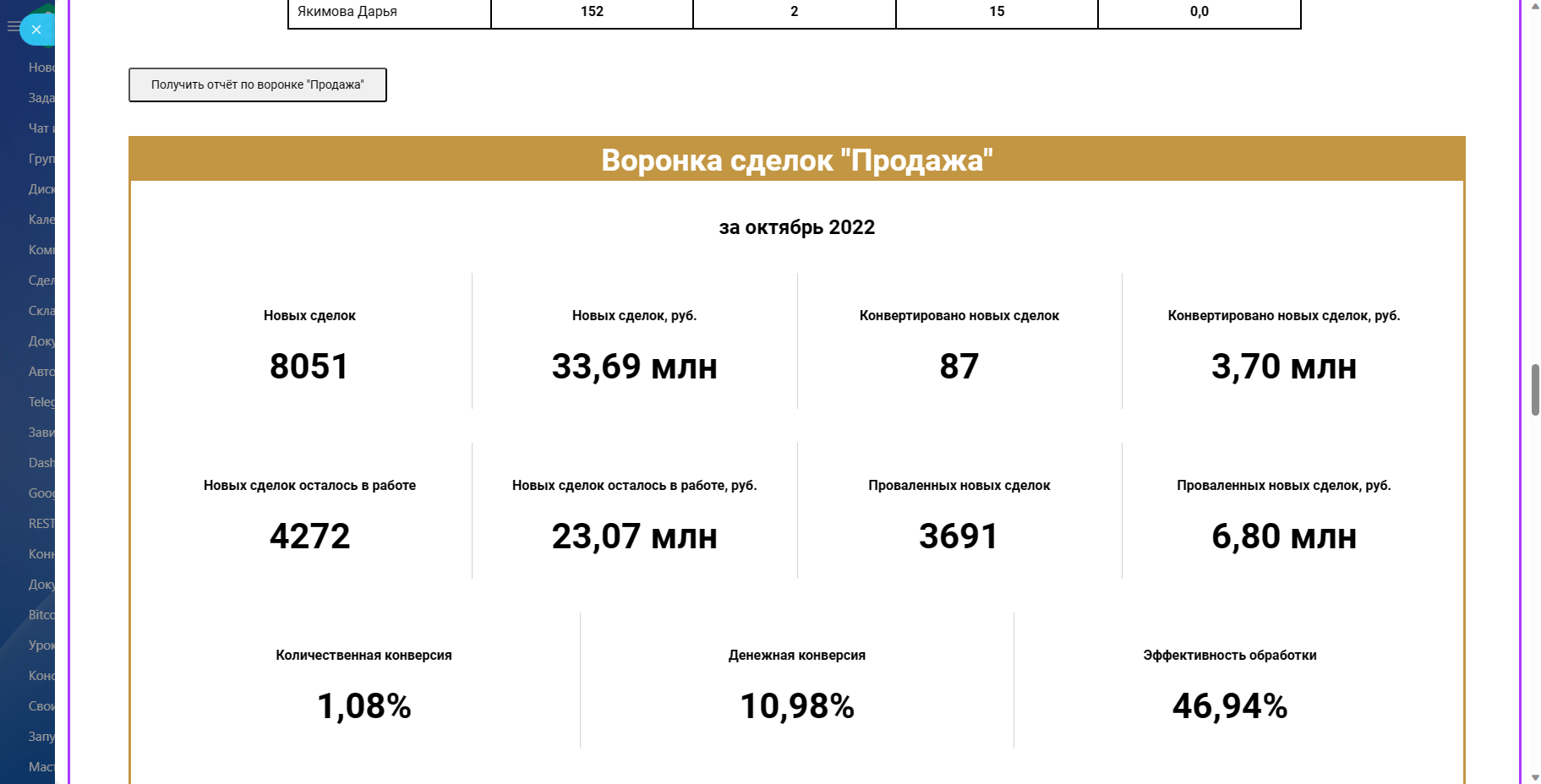 - Количество и сумму успешных, провальных и оставшихся в работе новых Сделок.