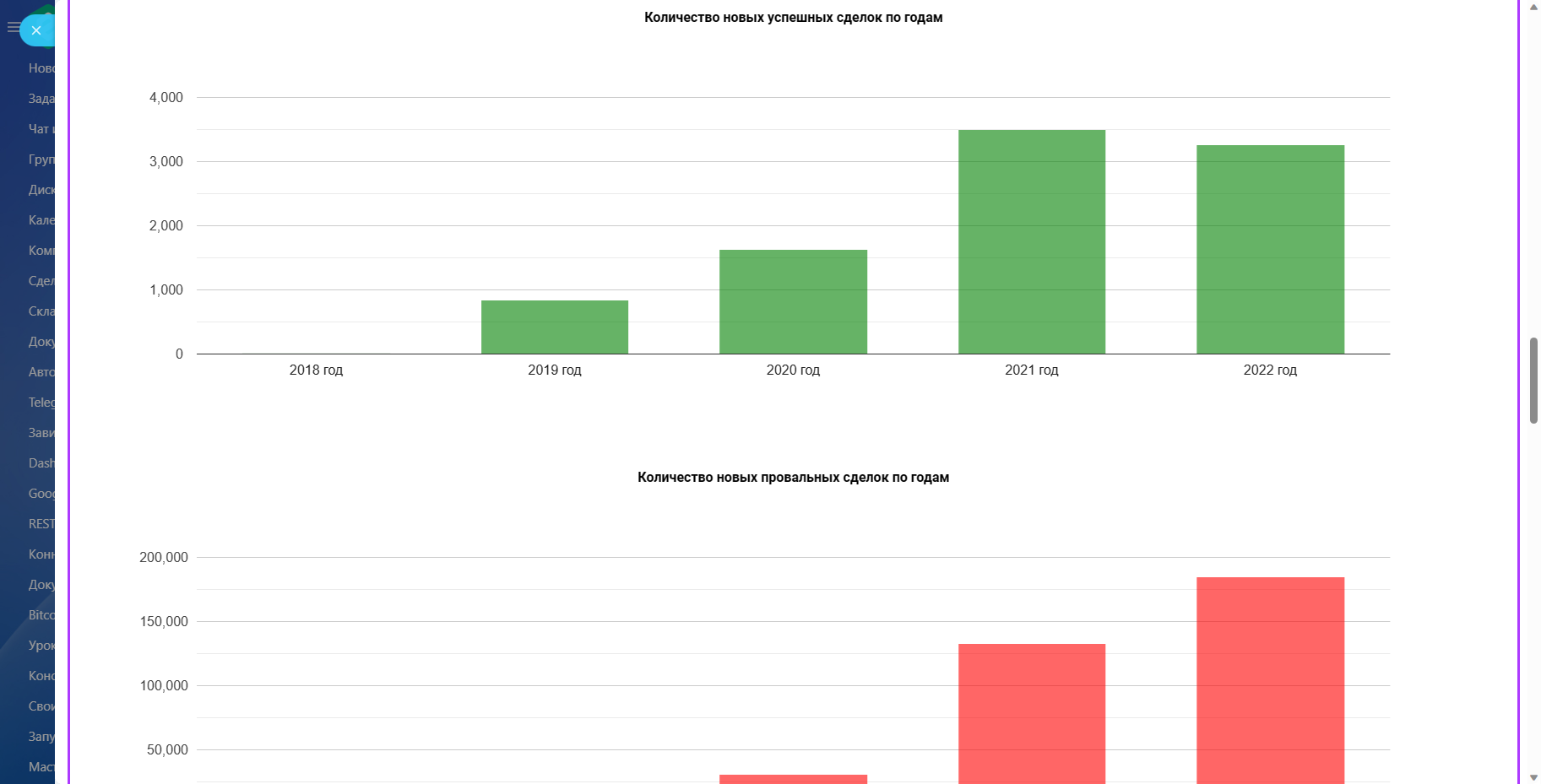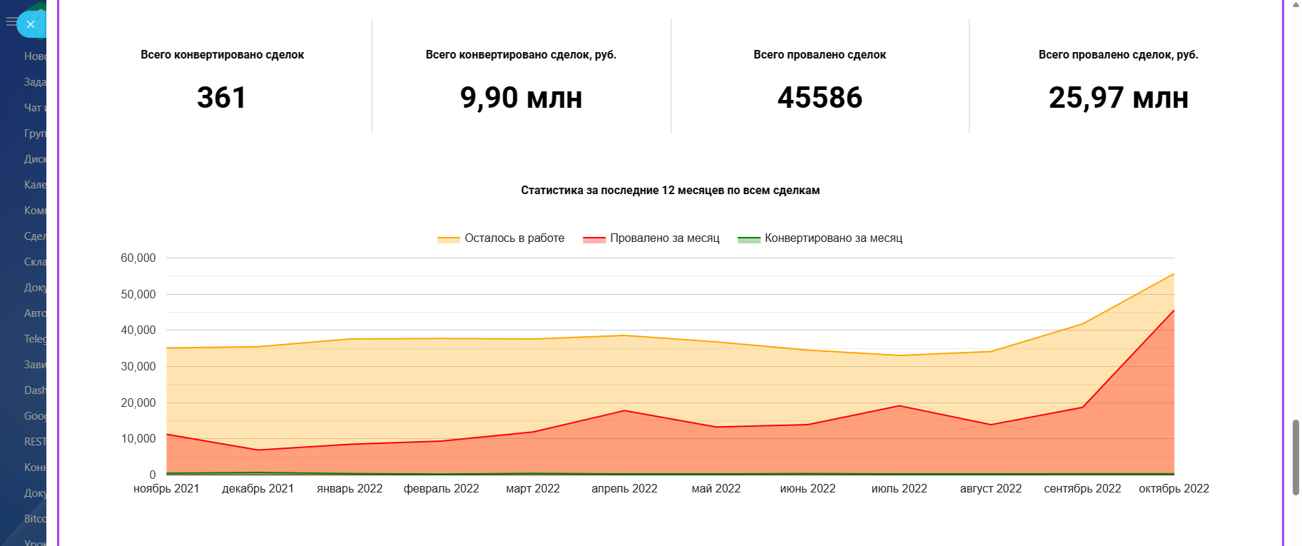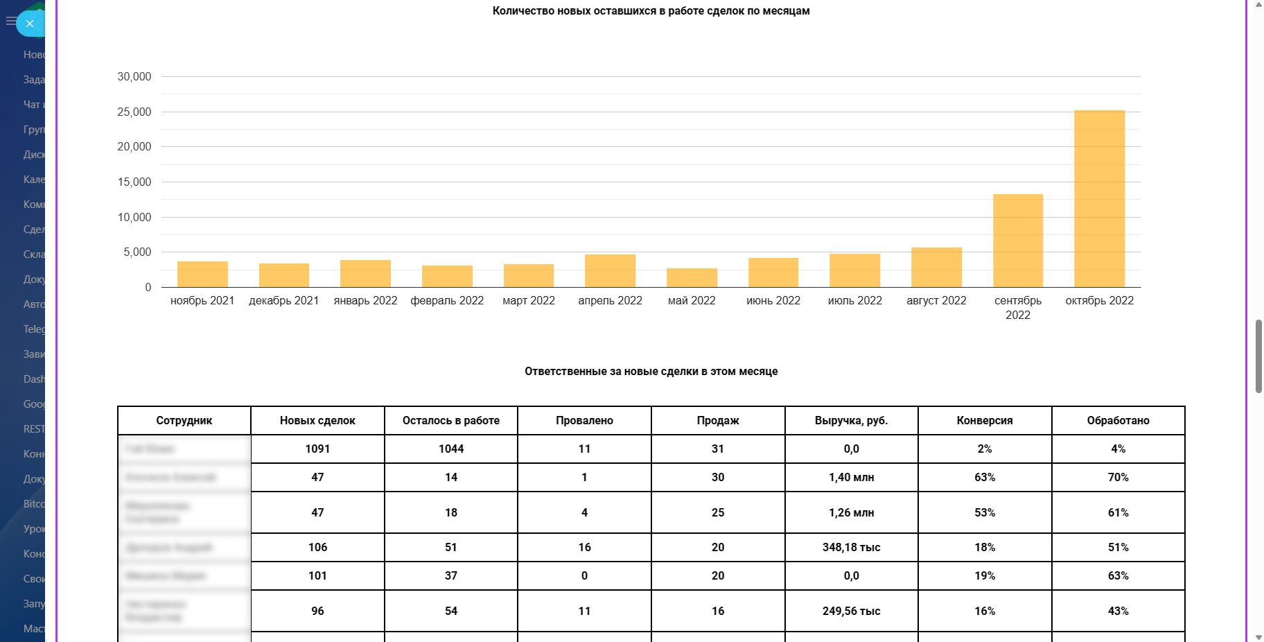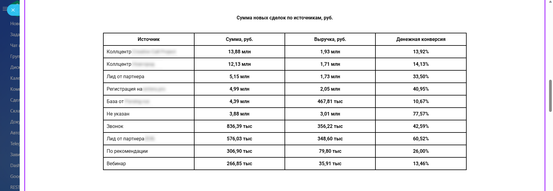 - Количество и сумму успешных, провальных и оставшихся в работе новых Сделок.