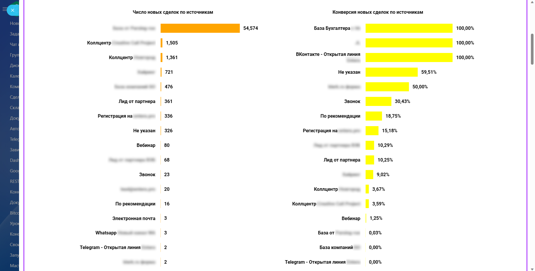 Приложение позволяет удобно анализировать данные по Сделкам, включая их источники. Таким образом, вы сможете оценить перспективность разных проектов и сконцентрировать внимание на самых прибыльных. Дополнительно, приложение поможет объективно оценить качество работы отдельных сотрудников или отделов.