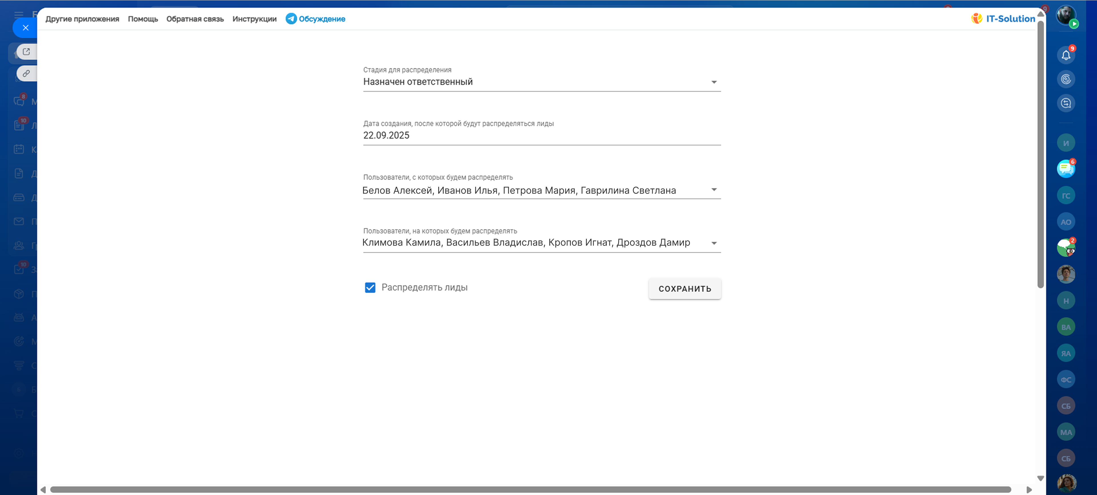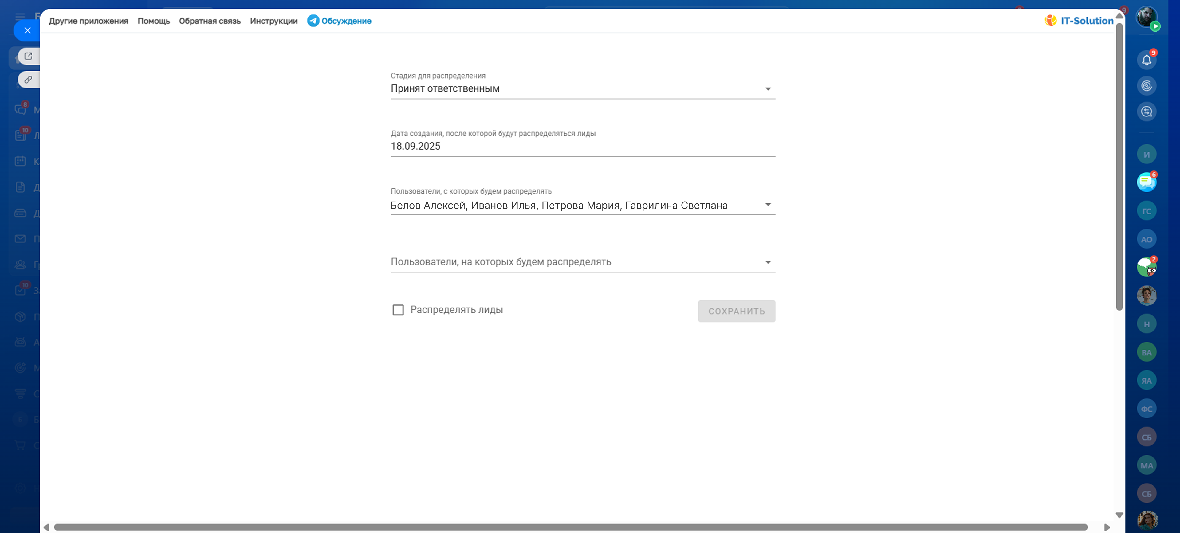 Сохраните настройки и поставьте галочку Распределять лидов. После этого раз в минуту будет срабатывать крон и перераспределять лидов согласно выставленным настройкам. Если в получателях указано несколько сотрудников, лиды будут распределяться между ними случайным образом.