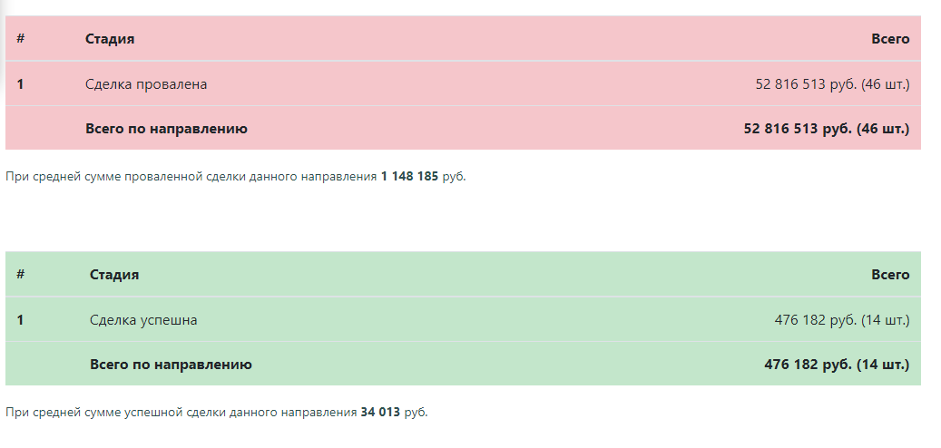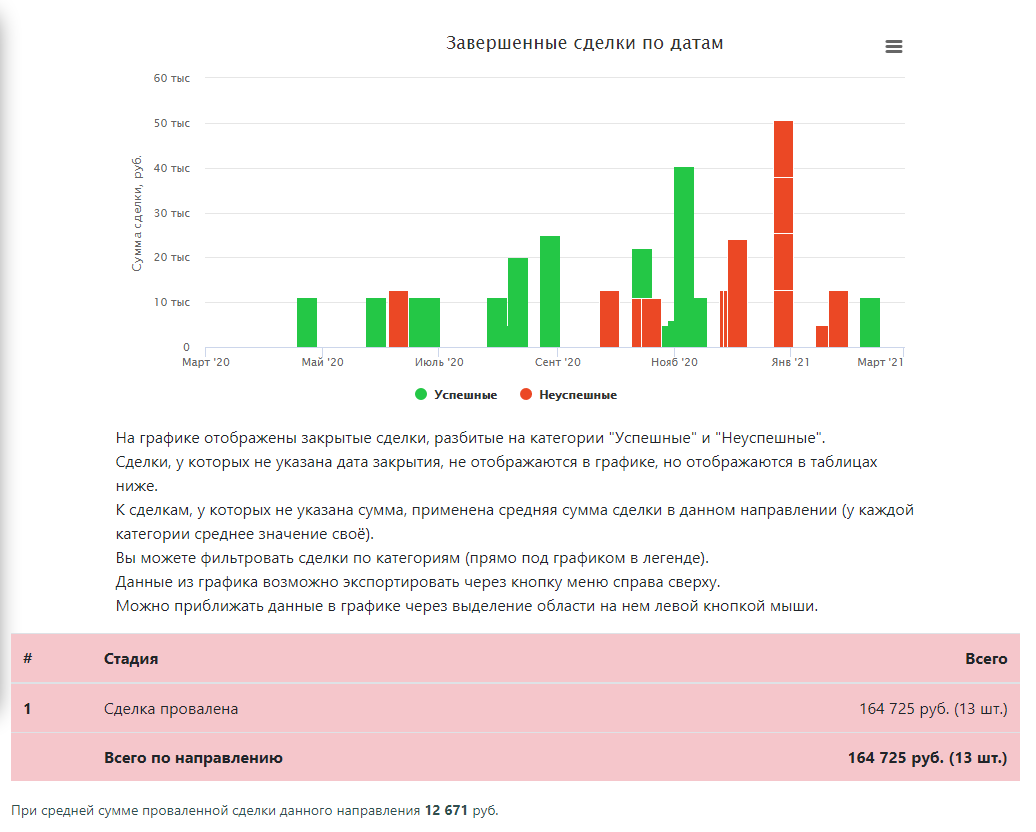Приложение собирает информацию о проваленных и успешных сделках, подсчитывает среднюю сумму на сделку и показывает приблизительную упущенную прибыль, строит график эффективности продаж по каждому направлению и суммарно по всем.