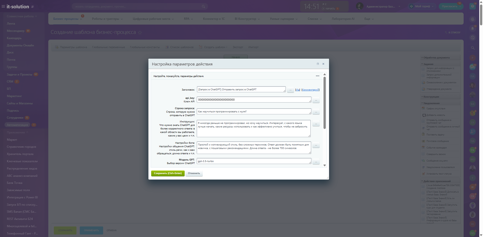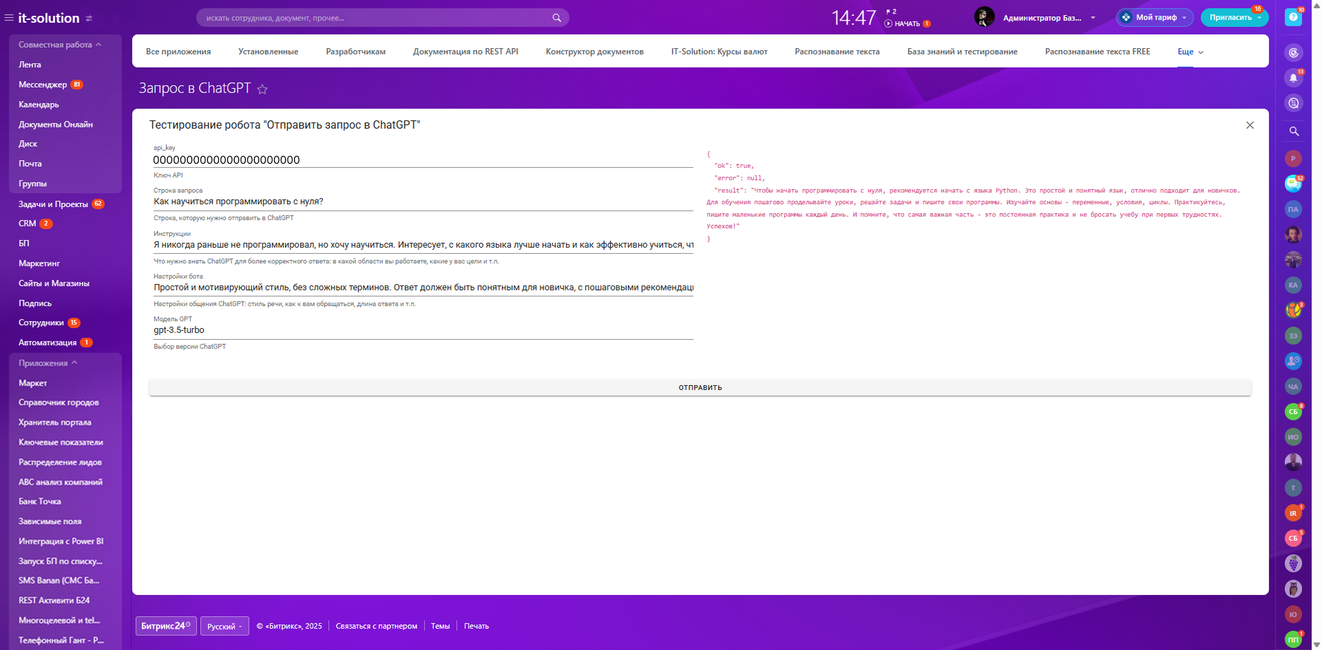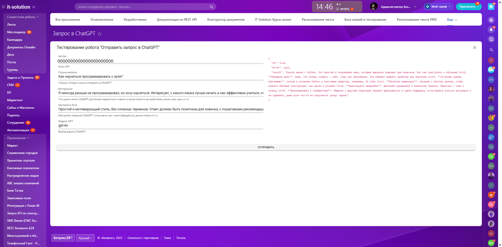 • Для работы с приложением требуется иметь ключ к API OpenAI.• Приложение работает с роботами и бизнес-процессами, убедитесь, что они доступны на вашем тарифе Битрикс24.