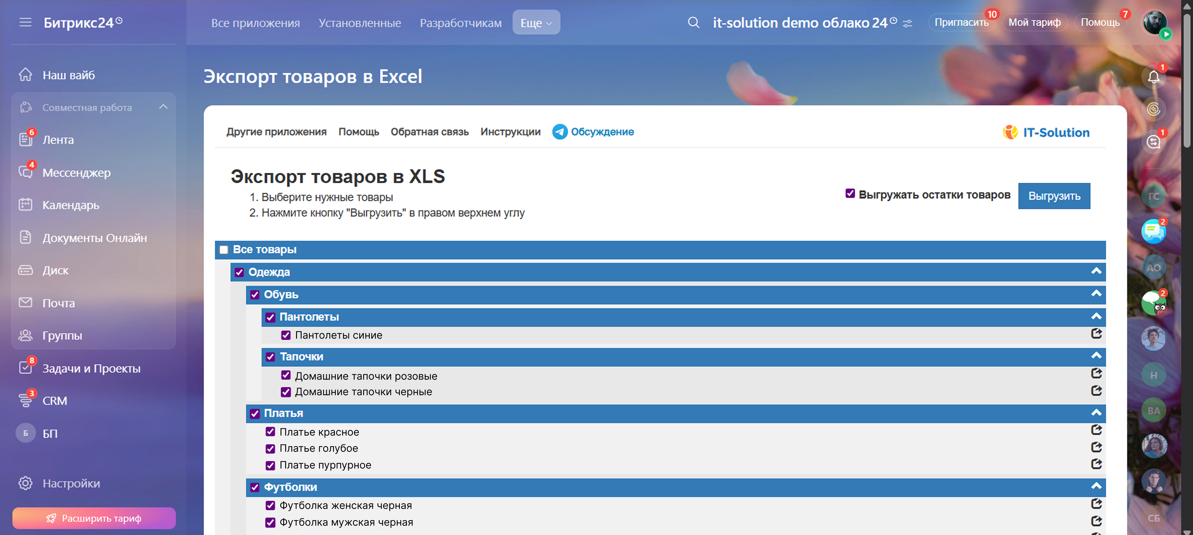 Приложение позволяет выгрузить товары из CRM Bitrix24 в Excel (XLS-файл)
