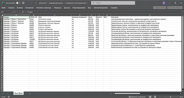 Экспорт товаров в Excel