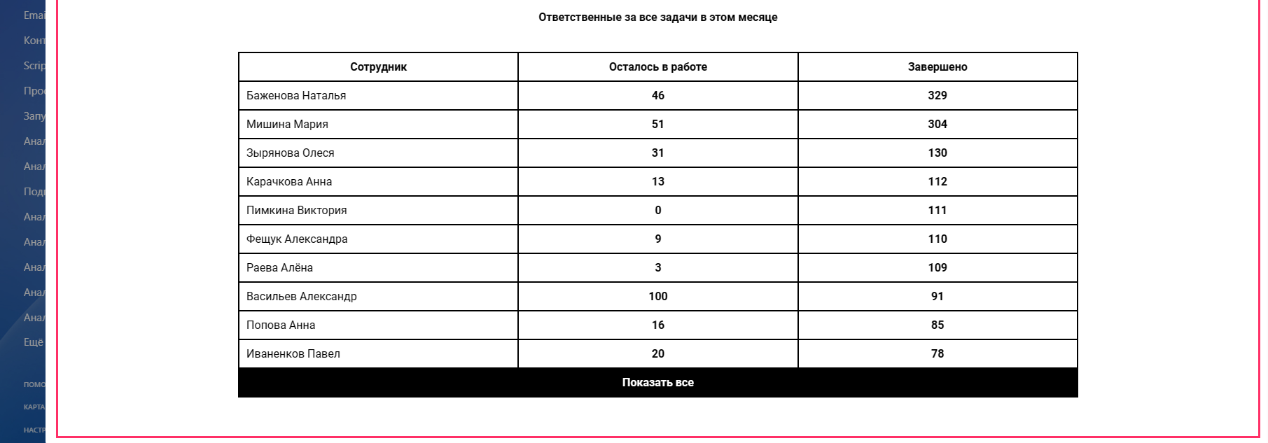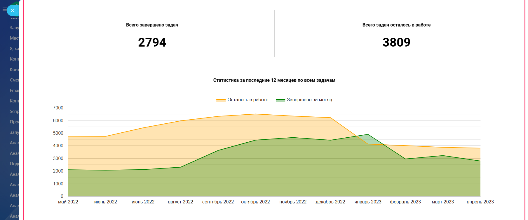- Количество всех завершенных задач за период и всех оставшихся в работе на конец периода.