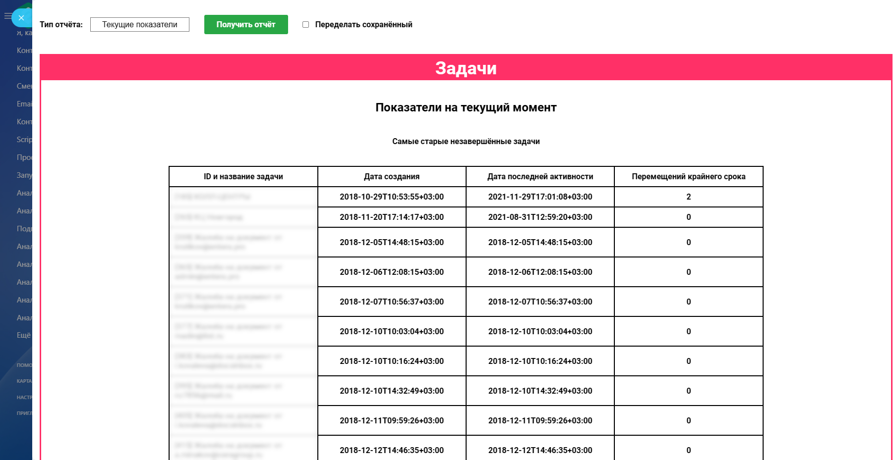 Также в отчёте по текущим показателям можно сформировать список 50 самых старых задач на портале с информацией об изменениях крайних сроков.