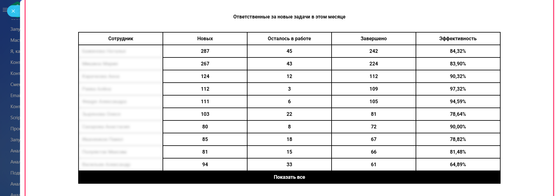 - Рейтинг ответственных за Задачи с основными показателями по новым и всем Задачам.