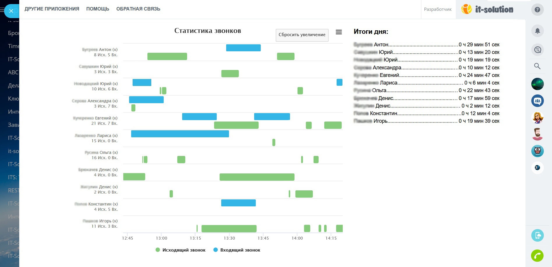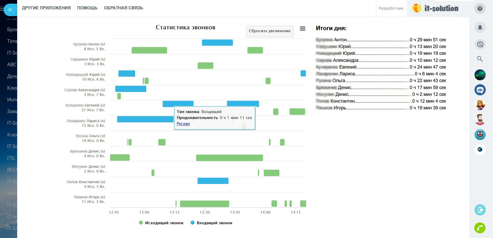 Отображает звонки пользователей на диаграмме Ганта