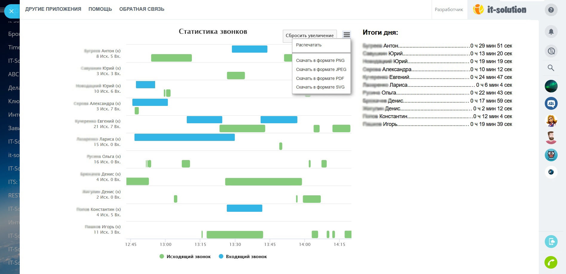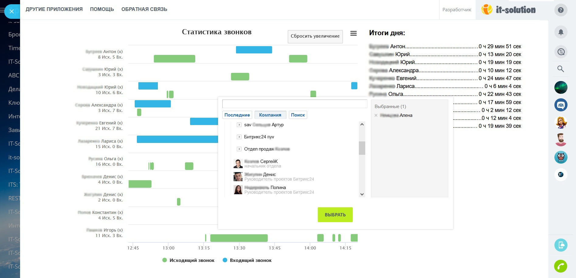 Приложение Телефонный Гант – это удобный и умный помощник, который наглядно показывает активность менеджеров по продажам. Отчёт выводится в виде графика звонков за любой интервал времени!