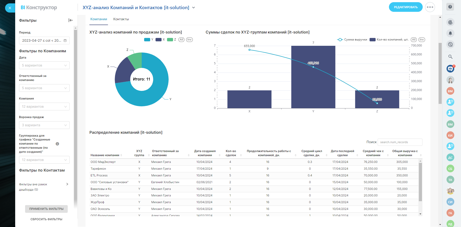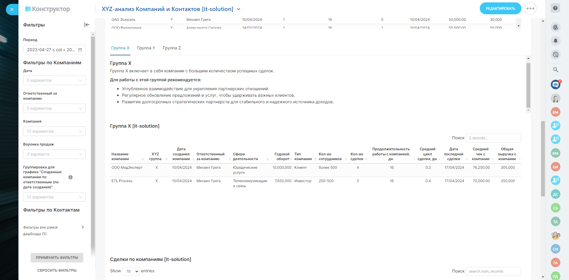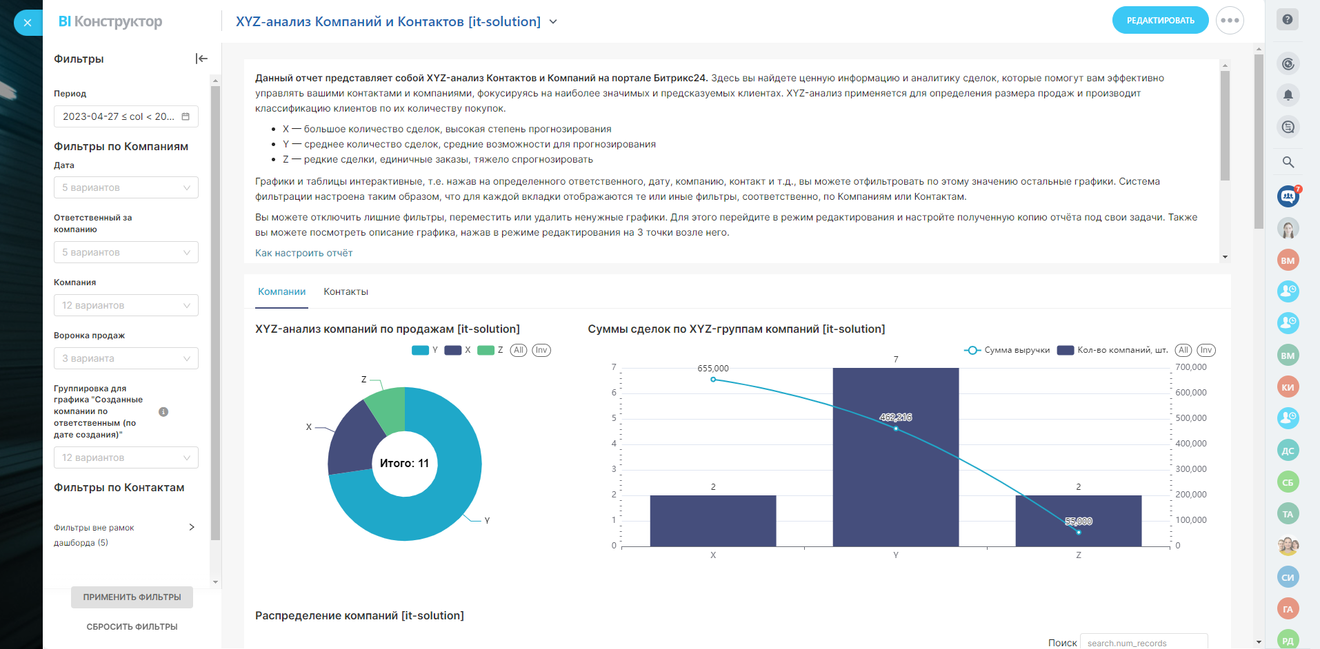 «XYZ-анализ Компаний и Контактов» — это детальный отчет успешных сделок с компаниями и контактами на вашем портале Битрикс24. С его помощью вы найдете ценные аналитические данные и рекомендации, которые помогут вам эффективно управлять вашими контактами и компаниями. XYZ-анализ предоставит вам возможность определить объем продаж и классифицировать клиентов по их количеству покупок, что в свою очередь позволит сосредоточить внимание и ресурсы на наиболее значимых и прибыльных клиентах.