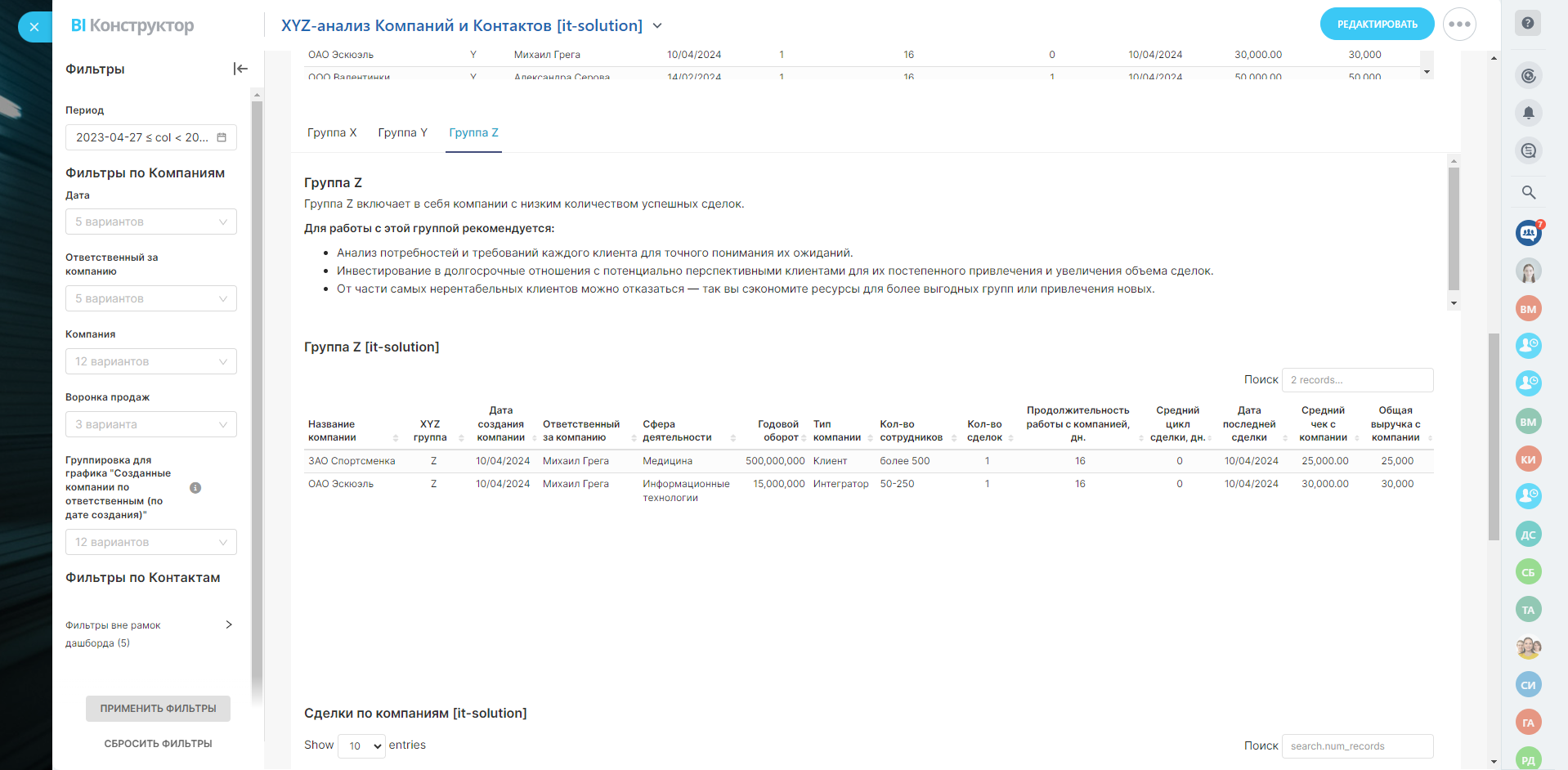 По каждой компании, входящей в группу Z, в разделе отображается: дата создания, ответственный, сфера деятельности, годовой оборот, тип, количество сотрудников, количество сделок, продолжительность работы, средняя продолжительность сделки, дата последней сделки, средний чек, общая выручка.