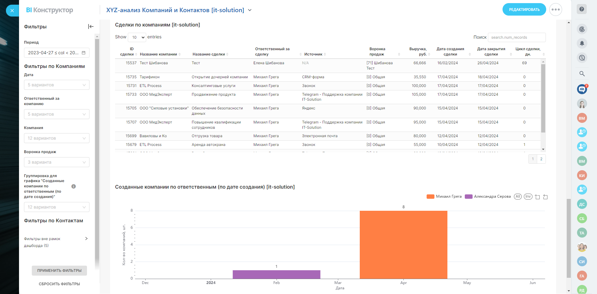 - Информация о сделках по компаниям: ID, название, ответственный, источник, воронка, выручка, дата создания, дата закрытия и цикл сделки.