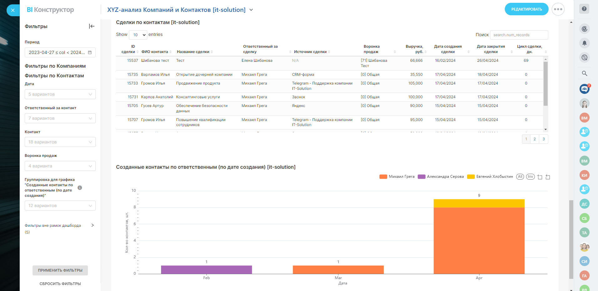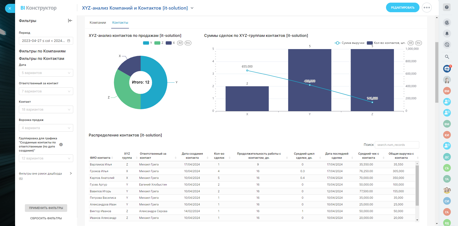 - Средний чек, общая выручка с контакта, ответственный за контакт.