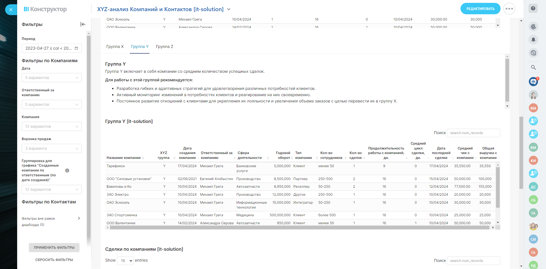 По каждой компании, входящей в группу Y, в разделе отображается: дата создания, ответственный, сфера деятельности, годовой оборот, тип, количество сотрудников, количество сделок, продолжительность работы, средняя продолжительность сделки, дата последней сделки, средний чек, общая выручка.
