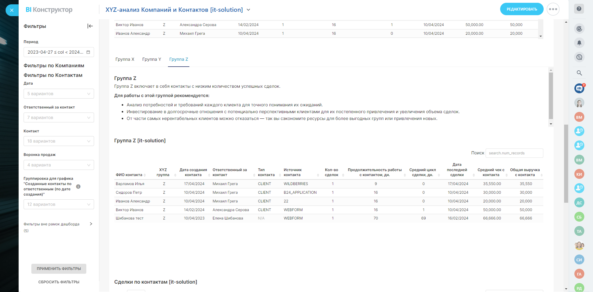 По каждому контакту, входящему в группу Z, в разделе отображается: дата создания, ответственный, тип, источник, количество сделок, продолжительность работы, средняя продолжительность сделки, дата последней сделки, средний чек, общая выручка.