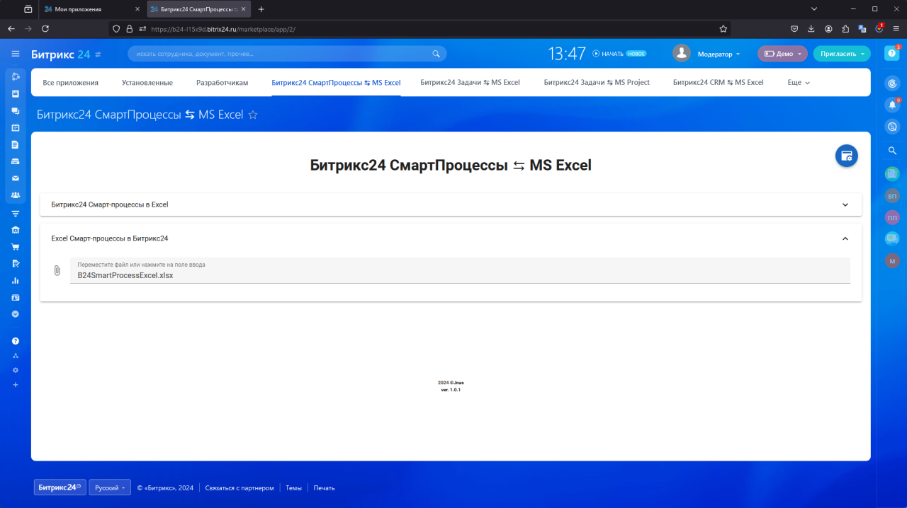 Данное приложение позволяет импортировать/экспортировать Смарт-Процессы из Bitrix24 в MS Excel и обратно.