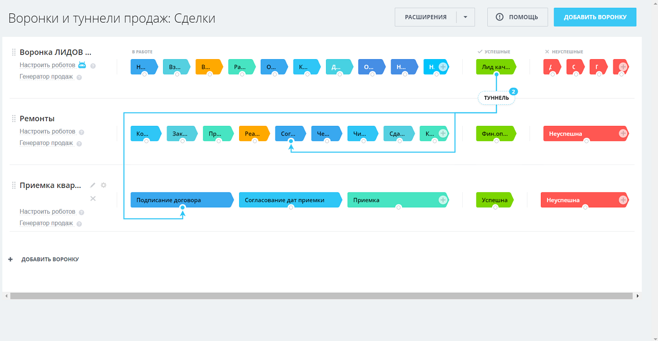 Воронка «Приемка квартир» содержит стадии: «Подписание договора», «Согласование дат приемки», «Приемка». Также воронка имеет успешную стадию: «Успешна» и неуспешную: «Неуспешна».
