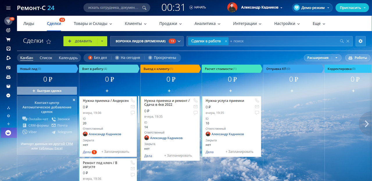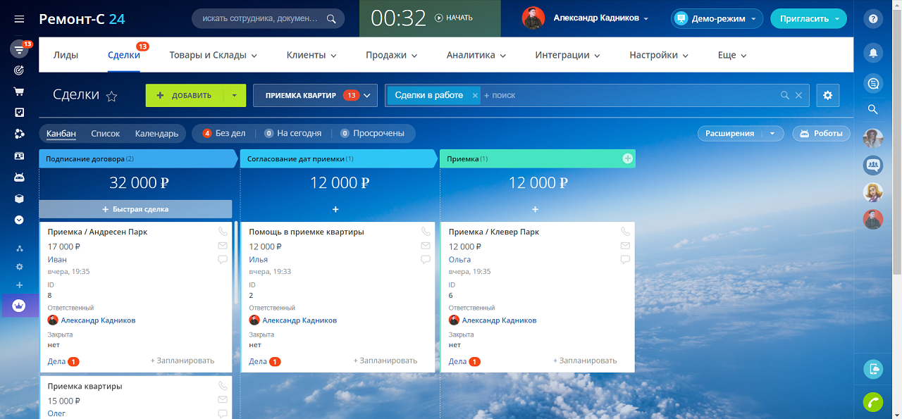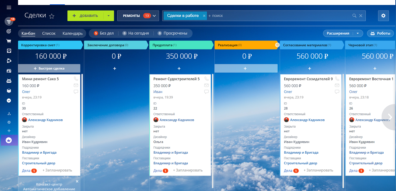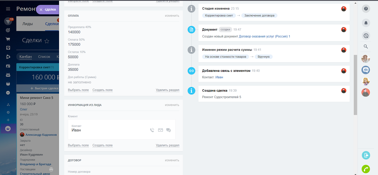 • Настроенные под ремонт квартир карточки сделок и клиентов;