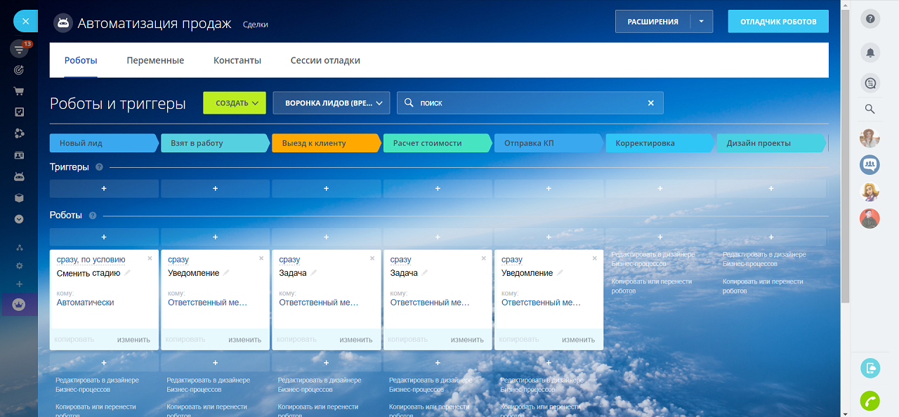 А роботы в CRM будут вам подсказывать, что нужно сделать на каждом этапе воронки.